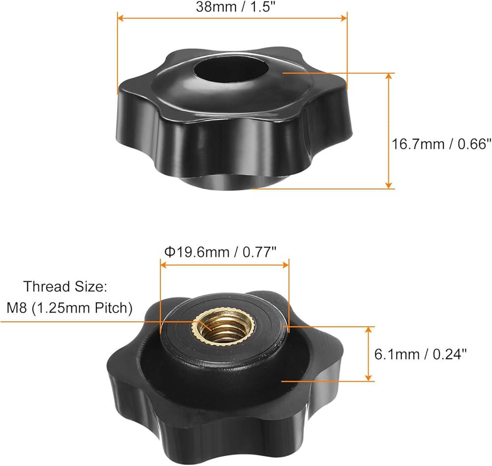 Note: Ensure that the knob is securely and properly installed on the corresponding male threaded component or fastener. Choose the star knob size that suits your needs. Do not over-tighten as this may cause damage of the knob or threaded parts.