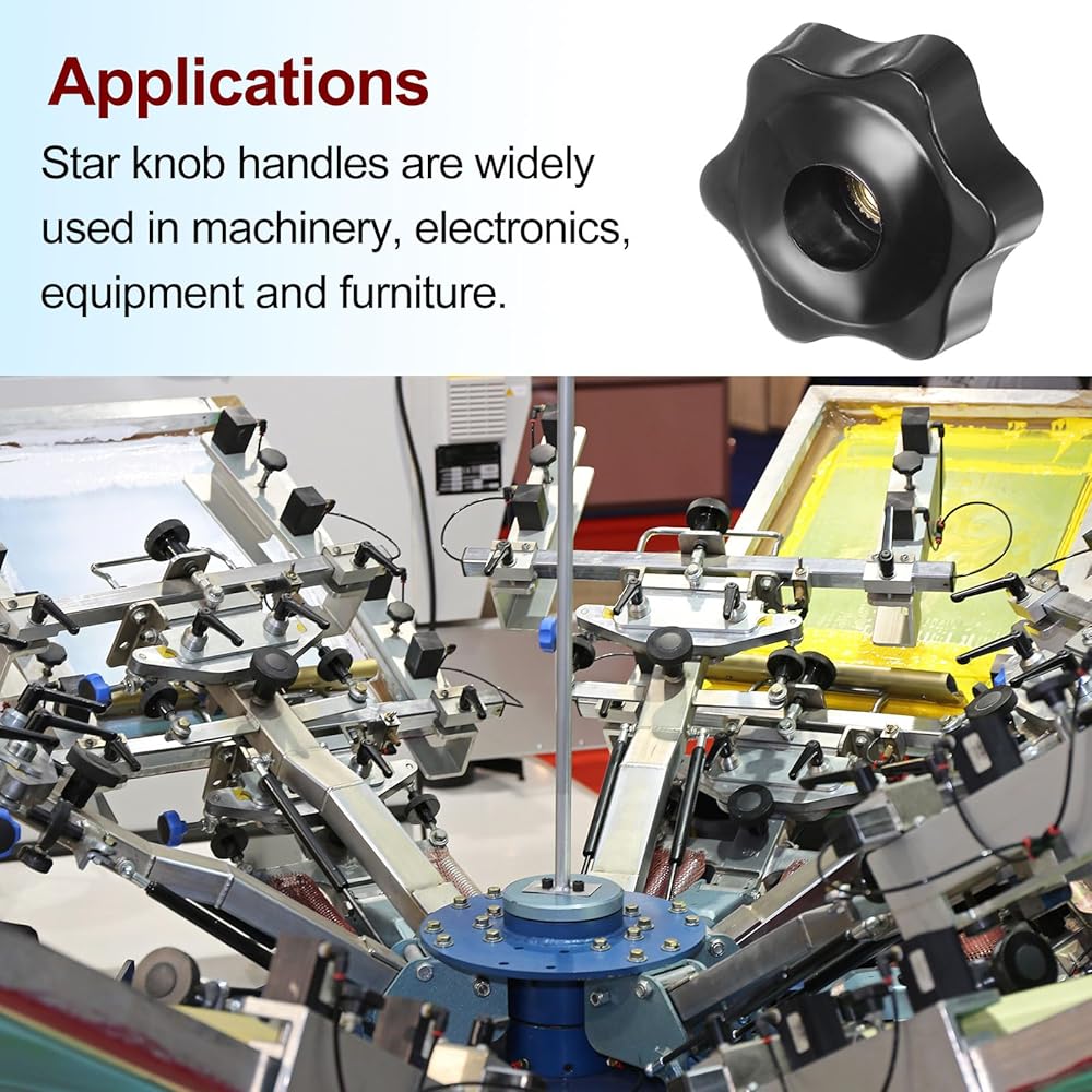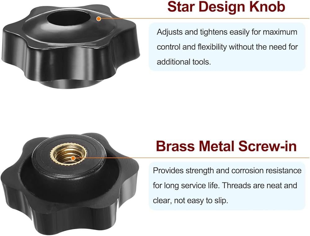 The star design adjusts and tightens easily for maximum control and flexibility without the need for additional tools. Clamping knobs feature tightly-in metal insert (won't strip) for a variety of threaded applications, making it easy to install and secure in place. Through hole female star handles allow for easy installation and removal, versatile mounting options.