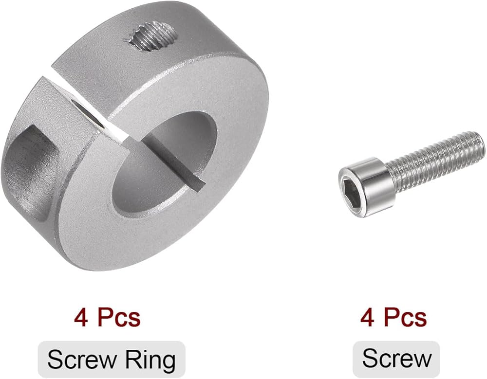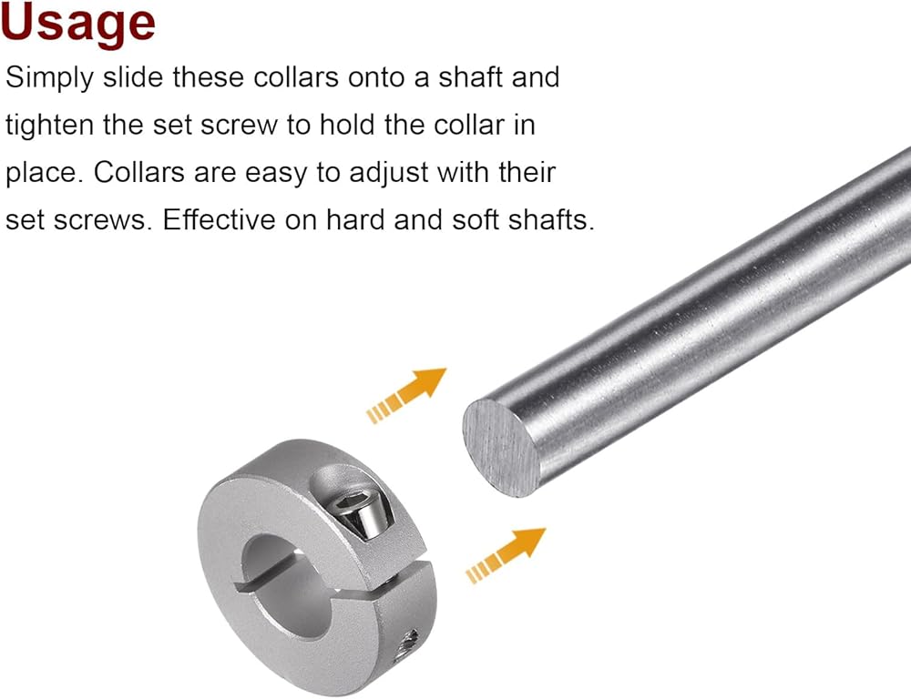 Usage - Simply slide these collars onto a shaft and tighten the set screw to hold the collar in place. Collars are easy to adjust with their set screws. Effective on hard and soft shafts.