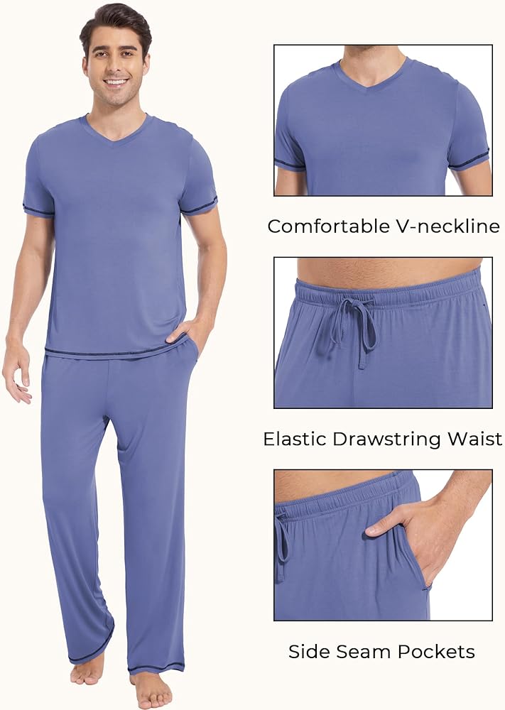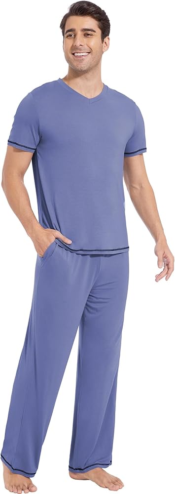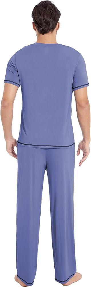 CHIC DESIGN: Elevate your loungewear with the V-neck short-sleeved top and stylish long sleep pants pajamas. The contrasting color stitching on the sleeves and pant cuffs adds a touch of sophistication to your casual look. Great holiday gifts for men of any age