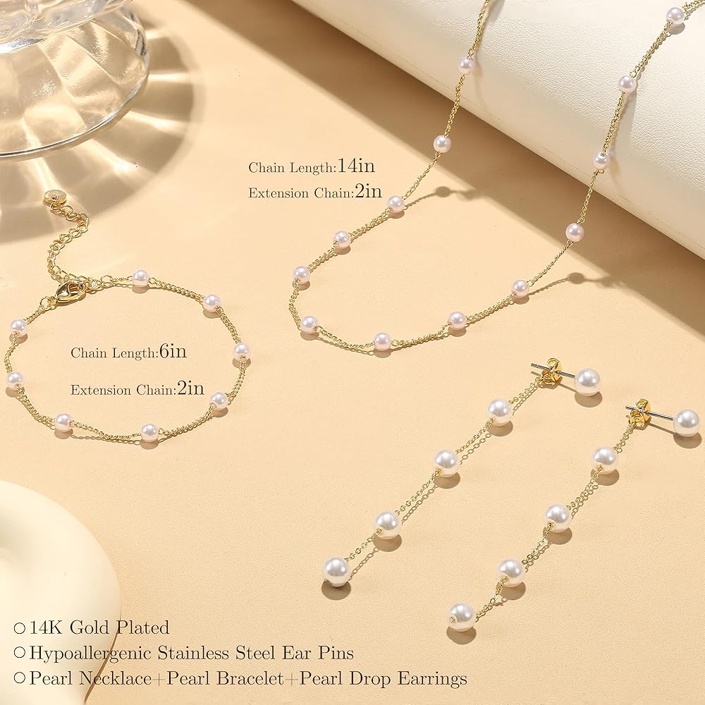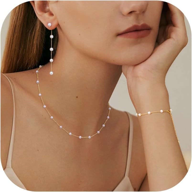 【𝐃𝐚𝐢𝐧𝐭𝐲 𝟏𝟒𝐤 𝐆𝐨𝐥𝐝 𝐏𝐞𝐚𝐫𝐥 𝐉𝐞𝐰𝐞𝐥𝐫𝐲 𝐒𝐞𝐭】:Discover the charm of our "Dainty 14K Gold Pearl Jewelry set", a harmonious collection for women, featuring pearl pendant necklace, elegant bracelets, and simple pearl drop earrings. Crafted with 14K gold thin chain,showcases the charms of small, high-luster pearls, offering a eternal addition to any outfit.