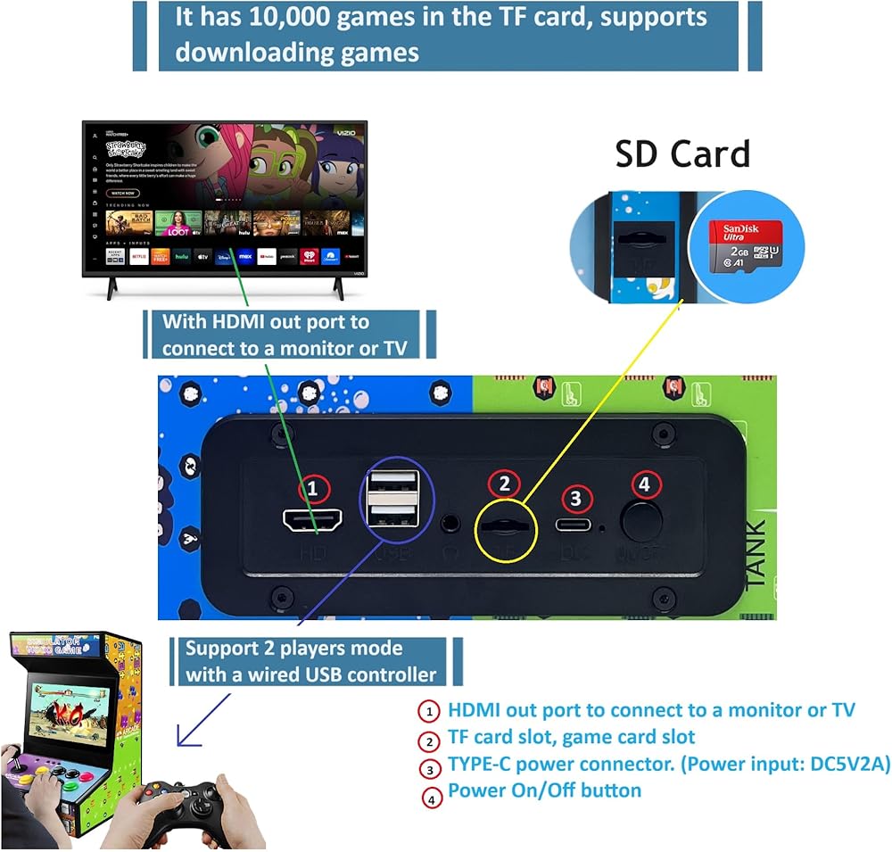 Massive Personal customization games - This game arcade console comes with one TF card that has 10,000 classic games, if you would like to more games, you can play any downloaded or friend-shared games, bringing you the best gaming experience.