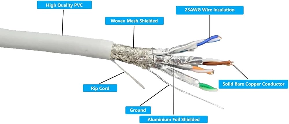 CAT7 Bare Copper Solid & Shielded S/FTP (Screened Foiled Twisted Pair) UL Listed for In-Wall and Riser Installation (CMR) ISO/IEC 11801 Verified, RoHS Compliant Supports up to 600MHz and Suitable for 1000BASE-T / 1000BASE-TX (Gigabit Ethernet) and 10GBASE-T (10-Gigabit Ethernet)