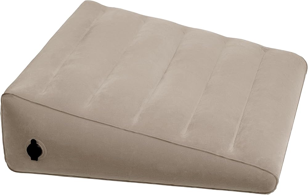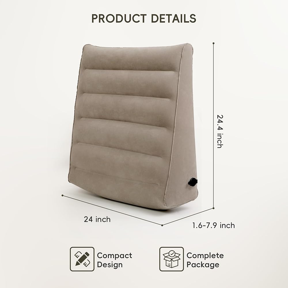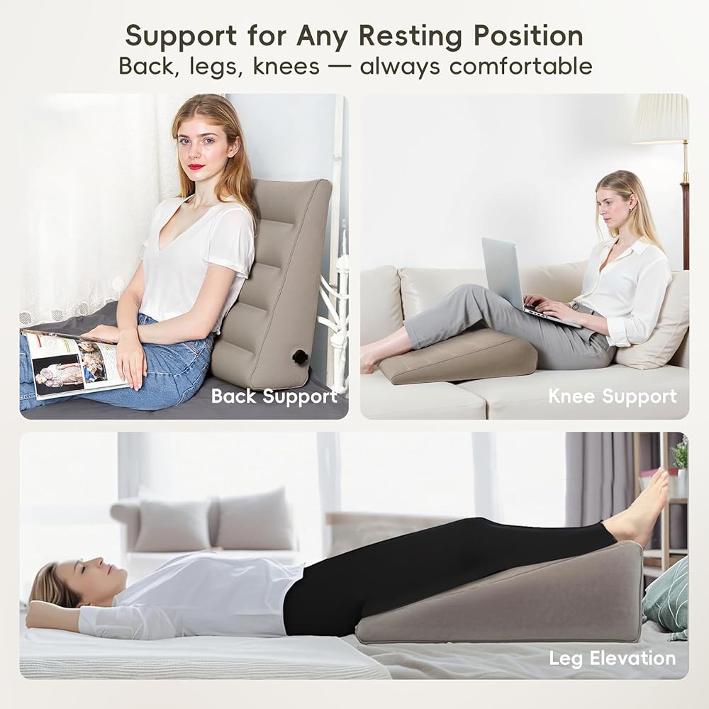Versatile inflatable wedge pillow can be used as a foot pad, back cushion when sitting on bed, knee or foot support pad