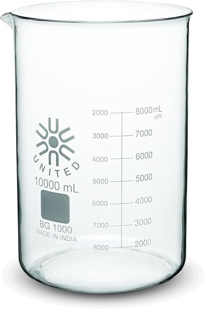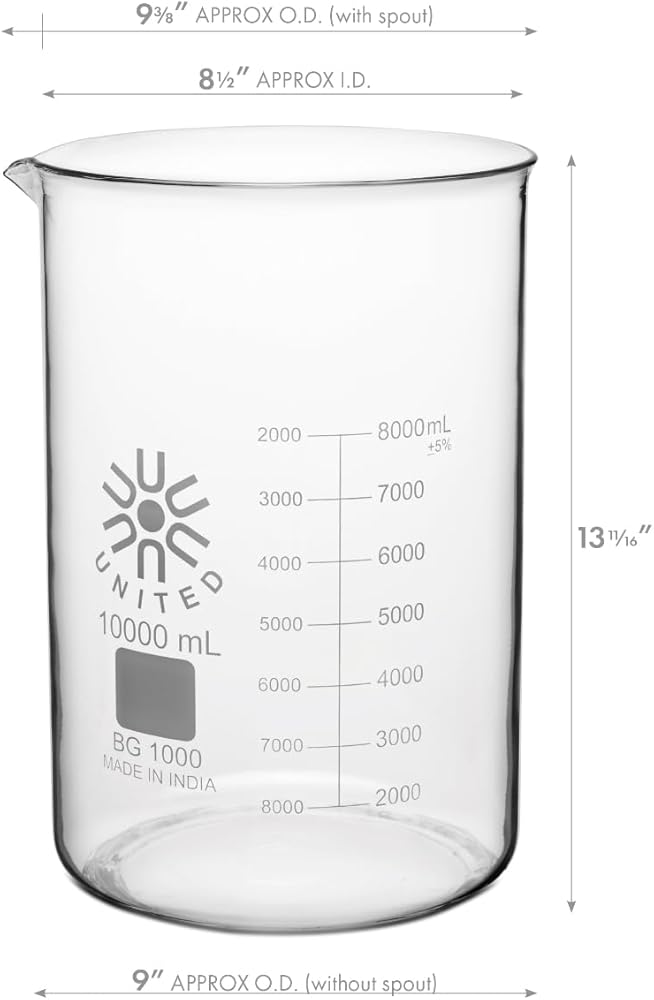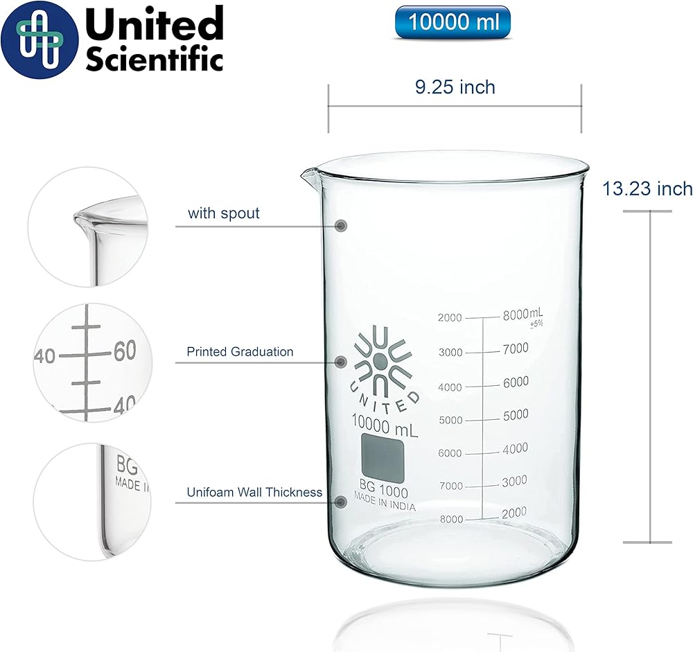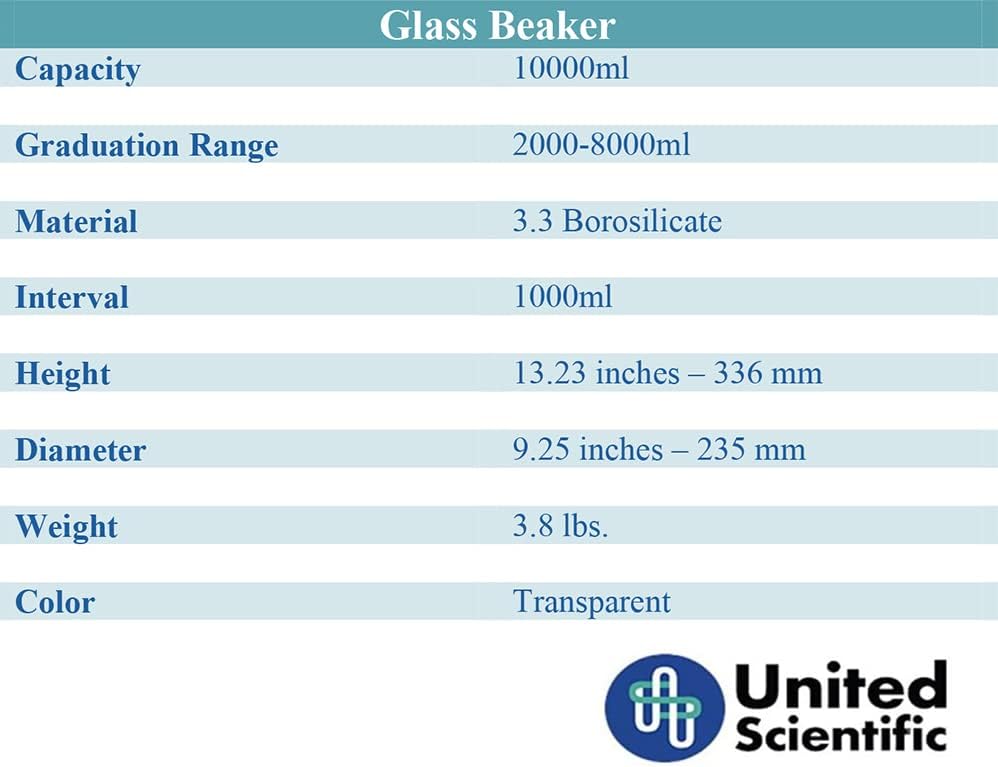 United Scientific™ (10,000mL) 10 Liter Glass Beaker - Low Form Griffin, Double Scale Graduation Chemistry Glassware, 3.3 Borosilicate Glass Beaker with Pour Spout, Beaded Rim and Autoclavable, 1 Each