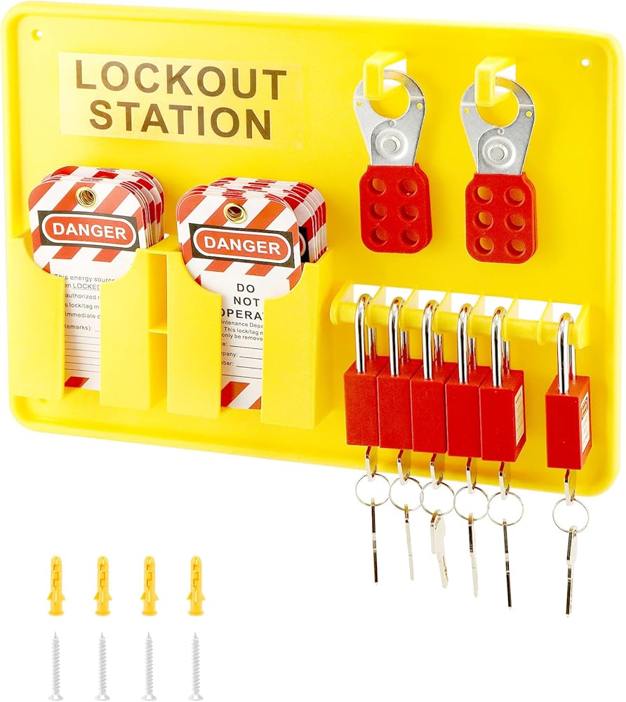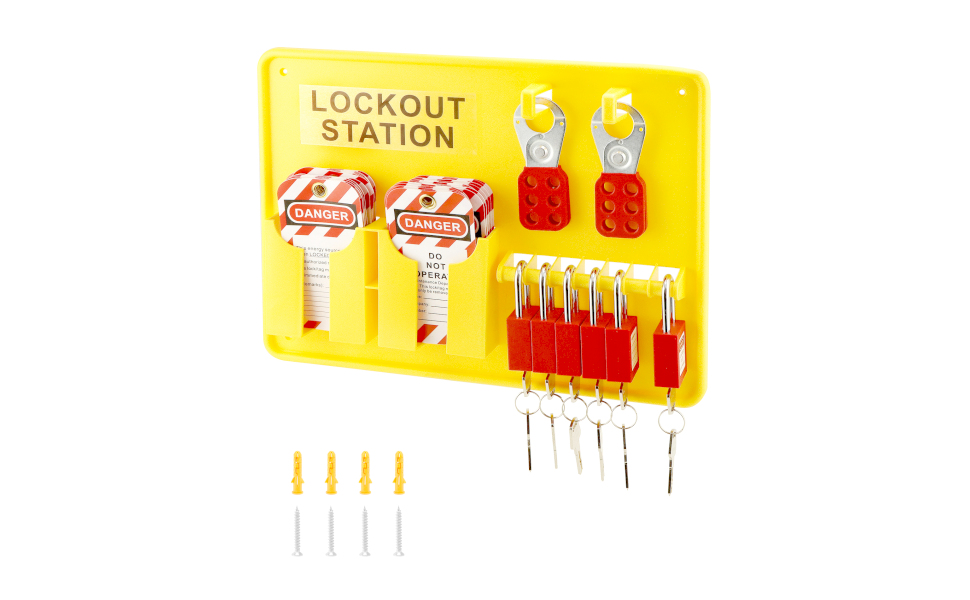 Lockout Tagout Kit: The loto kit includes 1 x lockout station, 2 x 1" hasp, 6 x safety padlock with 12 keys (keyed Alike), 20 x zip ties, and 32 x tags. The lockout devices will combine to protect the workplace and improve security.