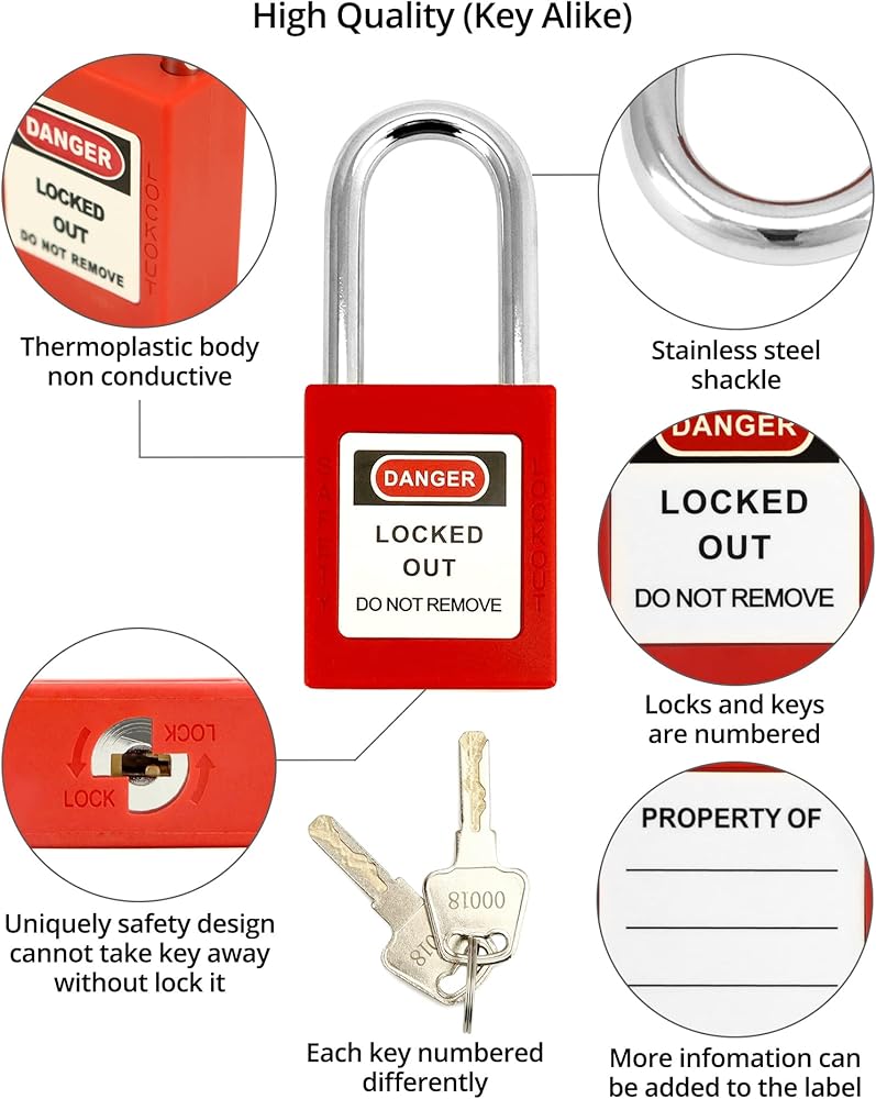 Safety Padlocks: Coming with 6 peces red safety padlocks, each lock is equipped with 2 keys, and keyed alike. The locks are made of nylon unibody, stainless steel shackle and key-retaining brass core cylinder, sturdy and durable.