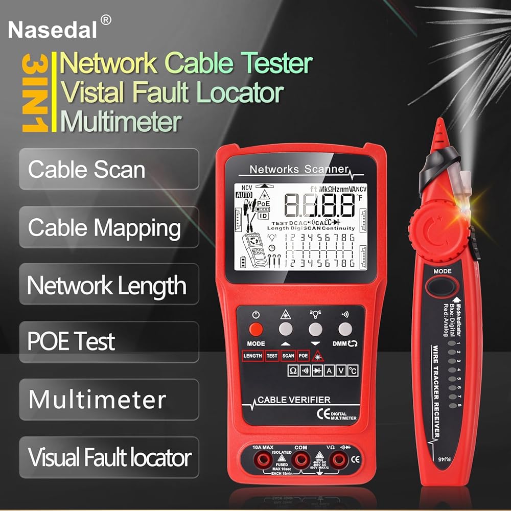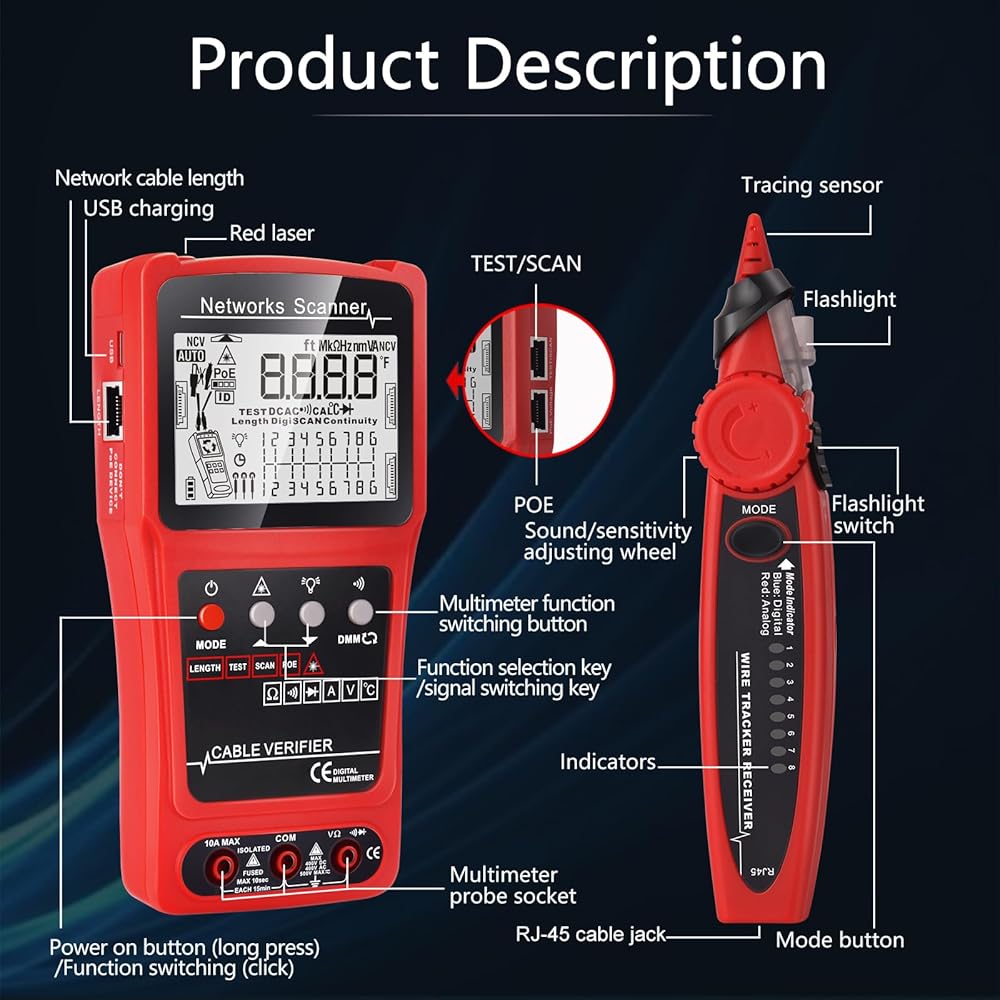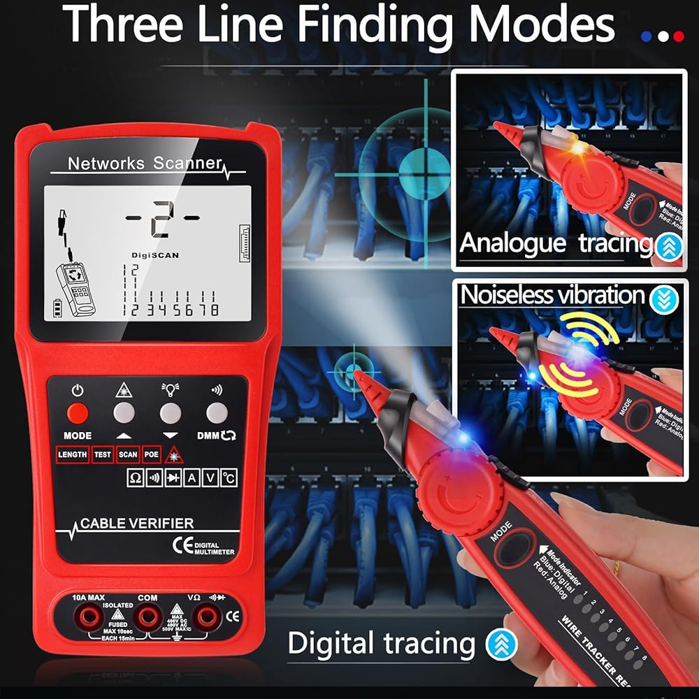 Anti-interference Network Cable Tester: Better display screen visuals,adopt advanced digital/analog/POE mode, high sensitivity, less noise interference, easy to accurately locate the target cable, widely used in engineering wiring, network and equipment maintenance