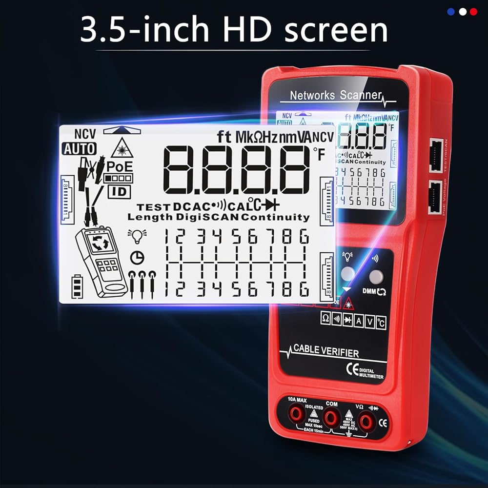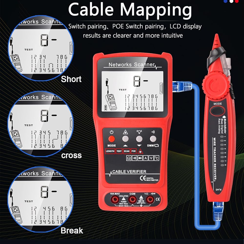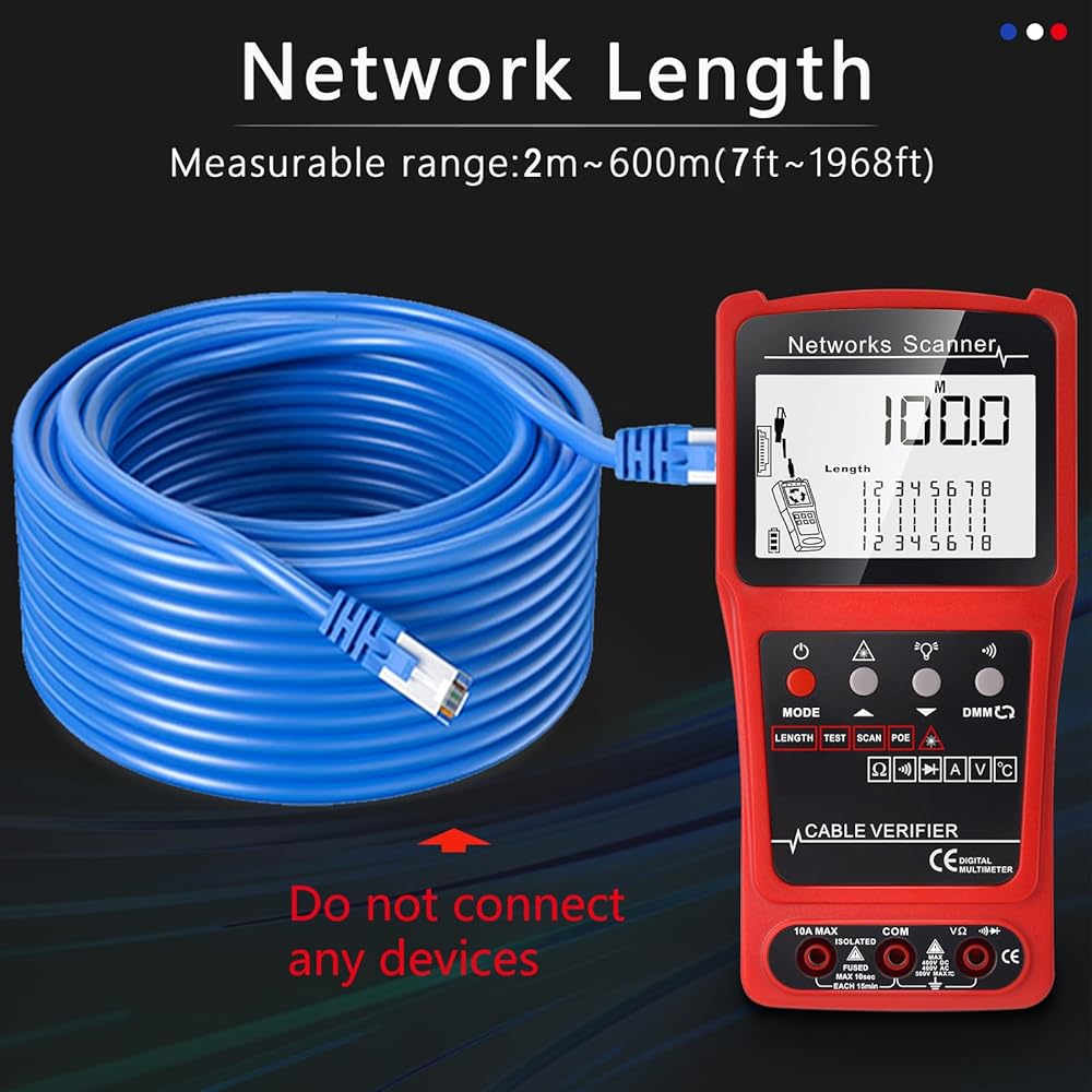 Cable Length Test: The tester can quickly measure the length of the cable with a range of 7ft-1968ft.The function can apply to different metallic cables including network cables,phone lines and BNC cable,etc.