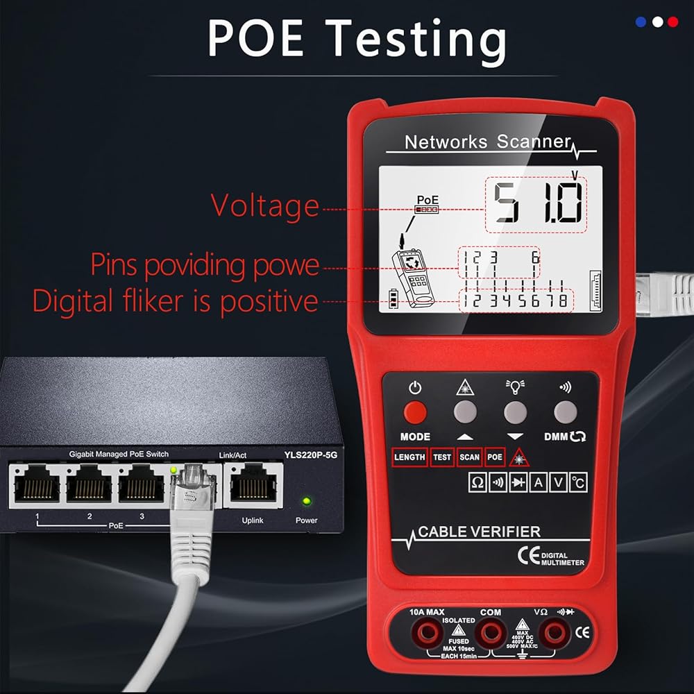 PoE Testing: PoE testing can check cable mapping polarity and voltage of PoE network switches, withstand 60VDC.