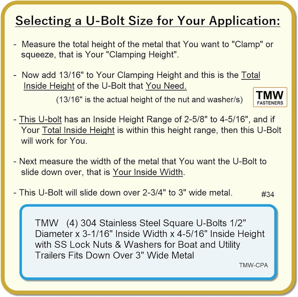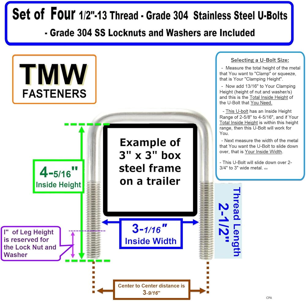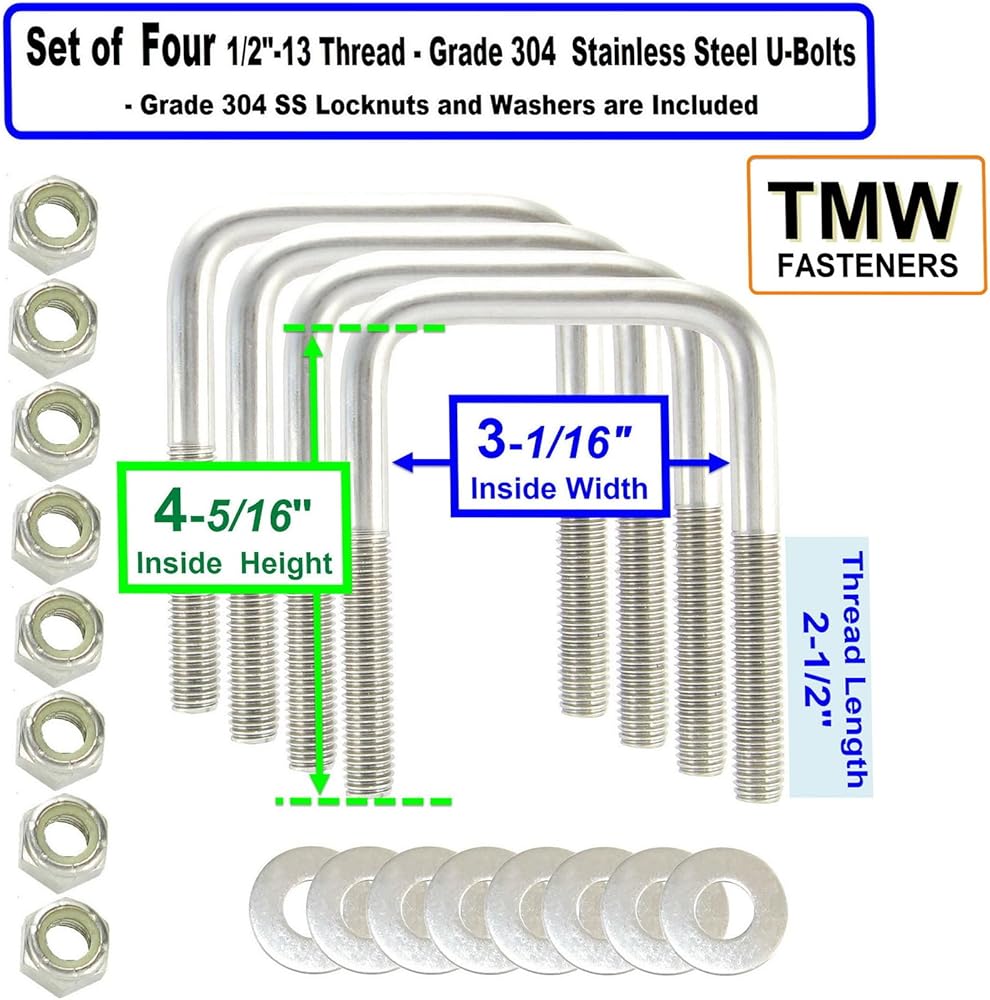 This package includes (4) Stainless Steel U-bolts and (8) Stainless Steel Flat Washers and (8) Stainless Steel Lock nuts. These U-Bolts are made in the USA out of high quality 304 Stainless Steel, and they along with the 304 stainless hardware included, hold up well in wet/salt water environments. The 3-1/16" width is the clear Inside measurement between the "Legs" of the U-Bolt. The 4- 5/16" Height (Length) is the inside dimension measurement from the top inside of the "U", to the bottom tip of the "Leg". ATTENTION: To determine the Height of the U-bolts You need, measure the total height of the metal and members to be "clamped" and add 13/16" for the nut and washers. To prevent "galling" (also known as "thread lock") use a hand ratchet or wrench to run up and tighten the nuts, do not use a an impact or powered socket driver. If a U-bolt is accidentally dropped in sand, thoroughly clean off the wax coating and re-apply lithium grease or candle wax to the threads to prevent galling. These U-Bolts will fit on 3" x 3" cross members, such as 3" x 3" box steel. Magnetism - In its originally formed state, 304 stainless steel is Austenitic and not attracted to a magnet but when threads are machined into the U-bolt 304 blank or when a washer is punched out of a 304 sheet blank, the working of the metal causes it to become slightly magnetic and a strong Neodymium magnet will pick them up, but a plain magnet will barely lift them, but they are still corrosion proof. CPA-4pk .