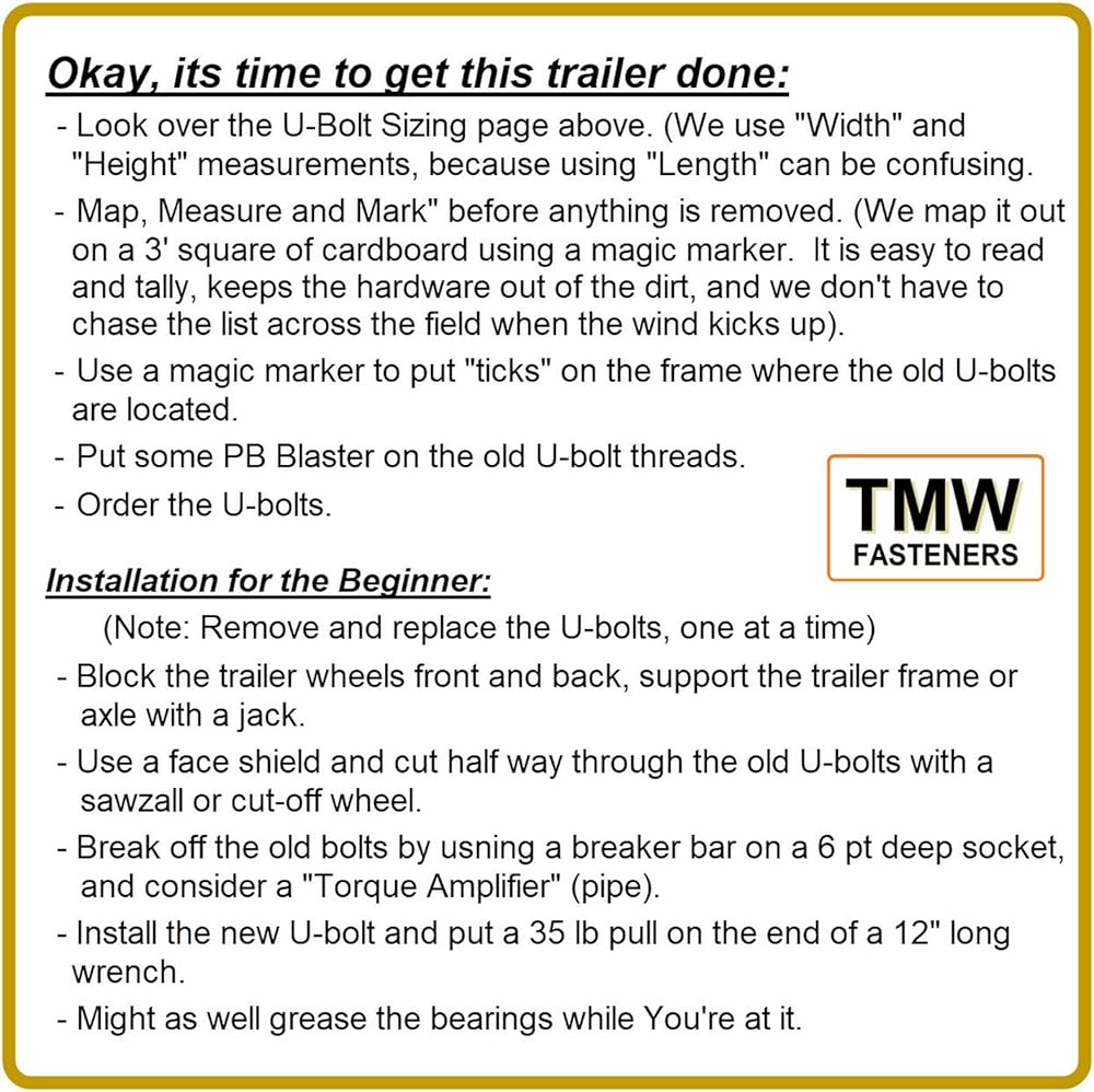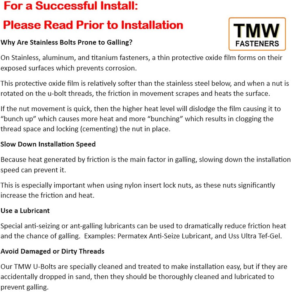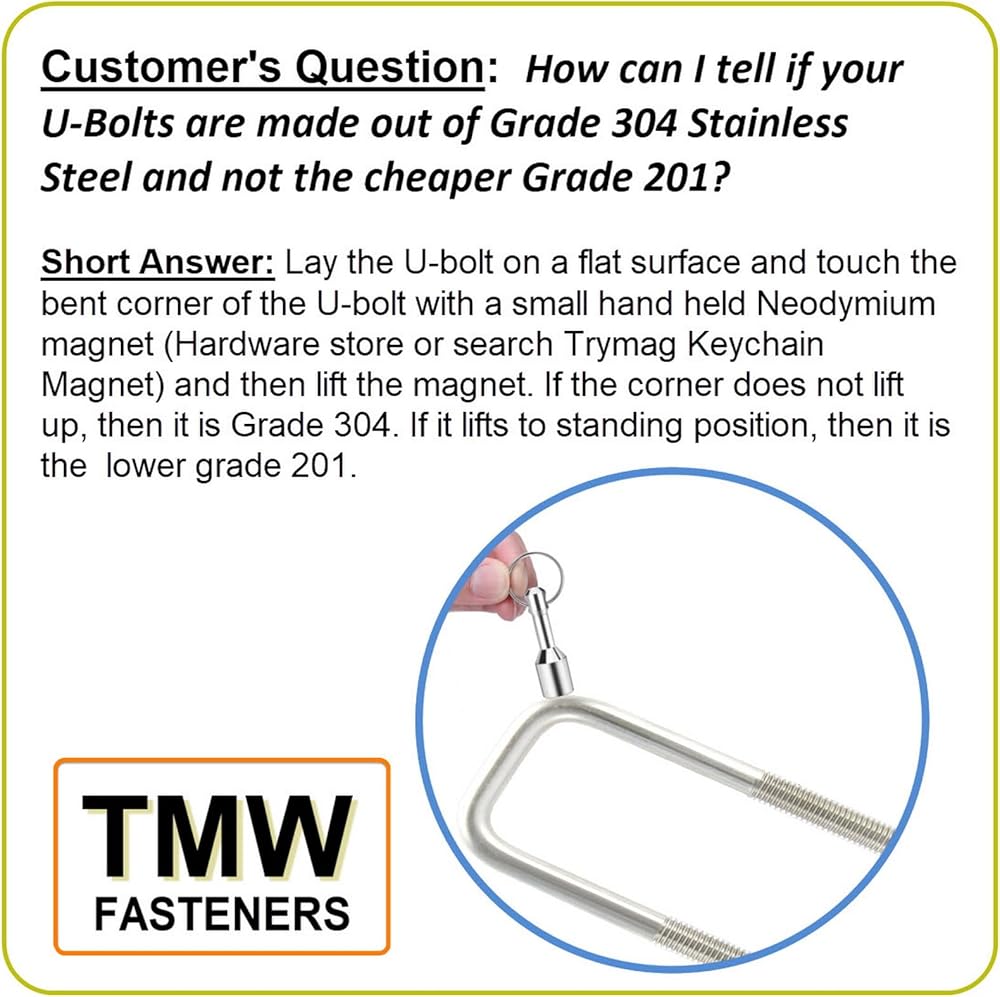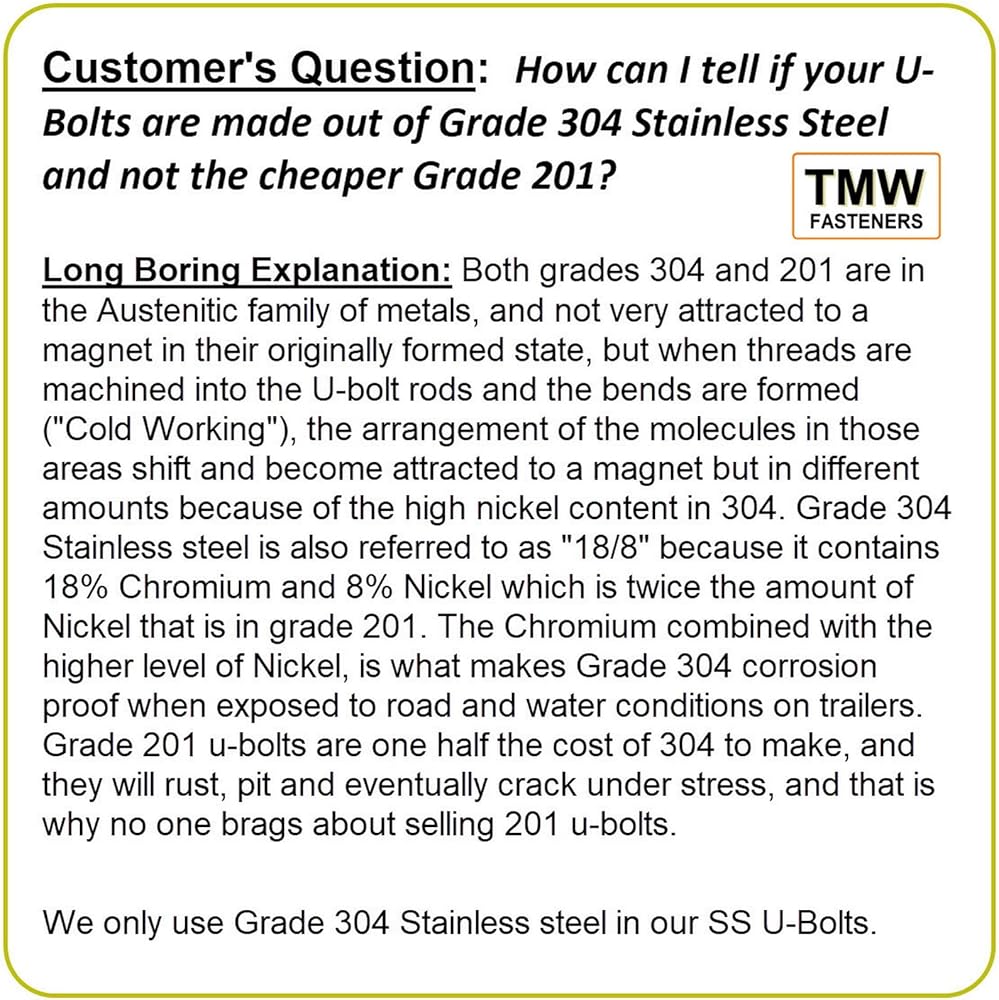 This package includes (4) Stainless Steel U-bolts and (8) Stainless Steel Flat Washers and (8) Stainless Steel Lock nuts. These U-Bolts are made in the USA out of high quality 304 Stainless Steel, and they along with the 304 stainless hardware included, hold up well in wet/salt water environments. The 3-1/16" width is the clear Inside measurement between the "Legs" of the U-Bolt. The 4- 5/16" Height (Length) is the inside dimension measurement from the top inside of the "U", to the bottom tip of the "Leg". ATTENTION: To determine the Height of the U-bolts You need, measure the total height of the metal and members to be "clamped" and add 13/16" for the nut and washers. To prevent "galling" (also known as "thread lock") use a hand ratchet or wrench to run up and tighten the nuts, do not use a an impact or powered socket driver. If a U-bolt is accidentally dropped in sand, thoroughly clean off the wax coating and re-apply lithium grease or candle wax to the threads to prevent galling. These U-Bolts will fit on 3" x 3" cross members, such as 3" x 3" box steel. Magnetism - In its originally formed state, 304 stainless steel is Austenitic and not attracted to a magnet but when threads are machined into the U-bolt 304 blank or when a washer is punched out of a 304 sheet blank, the working of the metal causes it to become slightly magnetic and a strong Neodymium magnet will pick them up, but a plain magnet will barely lift them, but they are still corrosion proof. CPA-4pk .