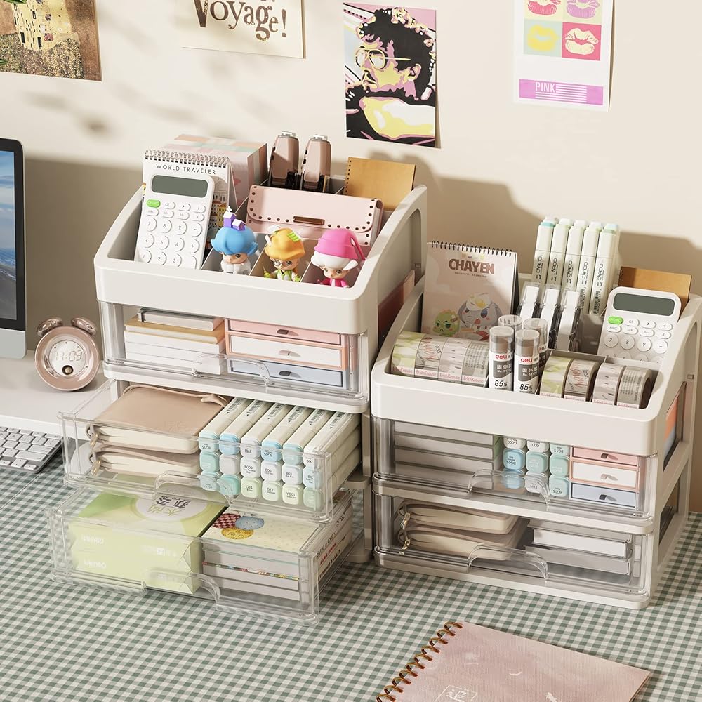 STACKABLE & VISIBLE-The clear desk organizer with drawers can be stackable in multi-layers, save your desktop/countertop space, transparent and visible storage drawer design allow you to find the item at a glance, perfect for makeup storage organizer, cosmetic display, jewelry and sunglasses storage and display, office supplies and school supplies organizer.