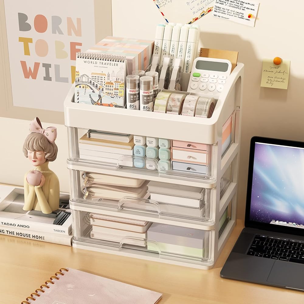 SUPER LARGE STORAGE DRAWERS: This plastic drawers organizers dimensions: 14.2"(L)x10.6"(W)x8.7"(H), super large storage drawer can hold a varity of office supplies, school supplies, makeup supplies, can hold A4 paper file and other project case, books, notesbooks, pens/pencils, markers, calculators, etc, keep your desktop clean, organized and tidy.