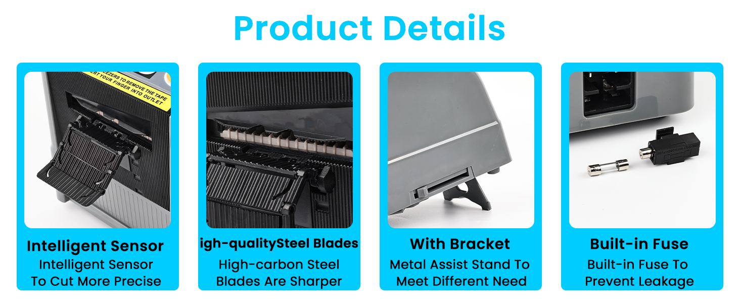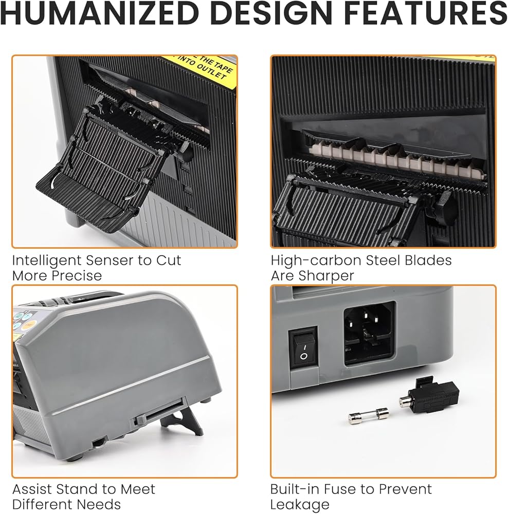 【Safer Design】Optical sensor cutting to prevent continuous cutting; the tape dispenser is made of anti-static ABS and has a built-in fuse to prevent leakage and injury; there is a tape pallet at the knife edge to prevent the hand from being cut when taking the tape ; When the machine is stuck, even if the obstacle is cleared immediately, the machine will not work immediately unless it is restarted.