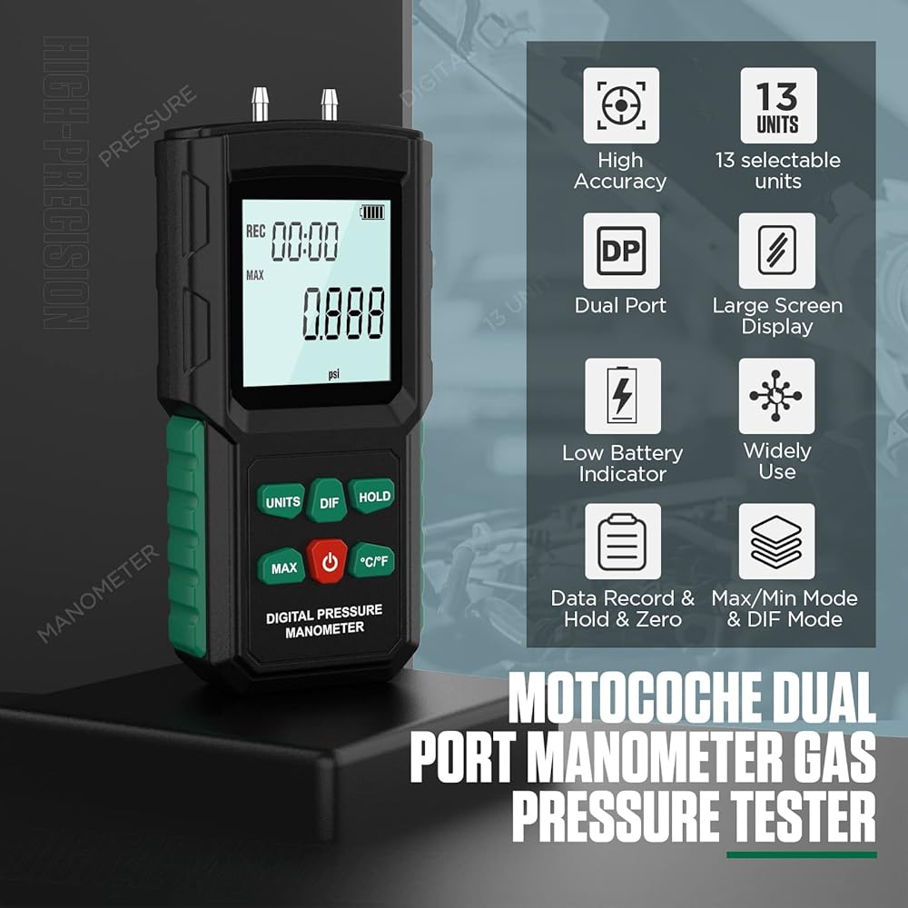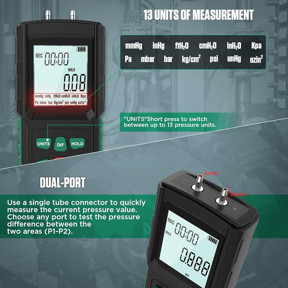 Manometer Gas Pressure Tester Dual-Port Manometer Differential Pressure Gauge 13 Selectable Units Gas Pressure Tester Digital Manometer HVAC Digital Manometer w/Backlight