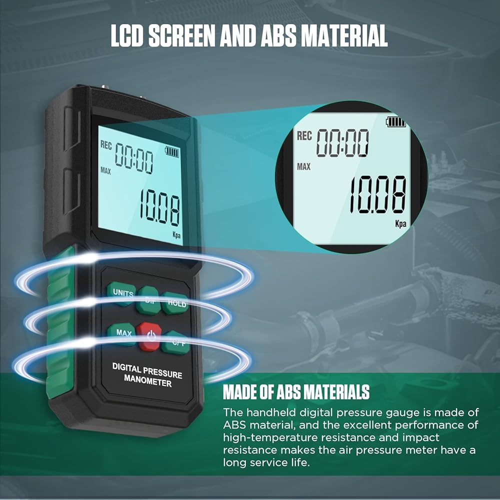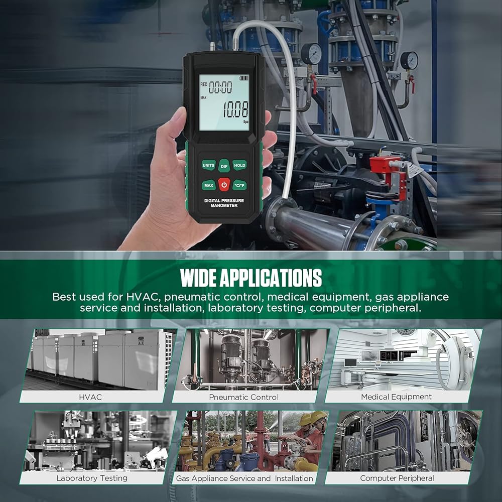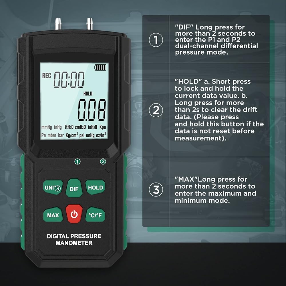 Professional Air Pressure Meter - This manometer is designed to accurately measure differential pressure of air or other non-corrosive gases. The dual-port design makes it easy to connect to different sources, can measure up to five inches of water column. allowing for a more versatile use of the device and comes with 13 selectable units and big screen with backlight. If you are in the market for a reliable manometer gas pressure tester, this one manometer is definitely worth considering.