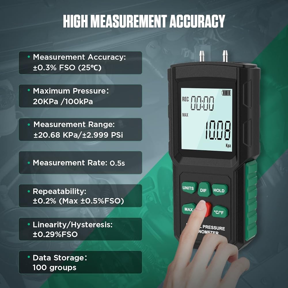 High Precision Manometer - Measuring Range: ±20.68 KPa/±2.999 PSi, Accuracy: ±0.3%FSO(25℃) Measurement rate: 0.5s. Single channel can measure the current detection pressure value, record max & min values during the measurement cycle. The dual channel can simultaneously detect the pressure difference between the positive pressure and negative pressure of the two detection ports. Compared with the traditional low precision pointer type manometer, this barometer measures accurate and stable data.