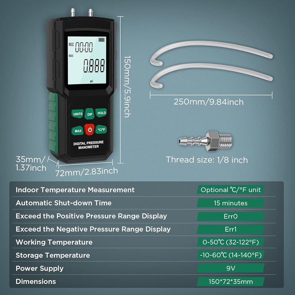 13 Pressure Units - Differential pressure gauge "UNITS button"(Psi. kg/cm2. 0z/in2. bar. mbar. Pa. inHg. mmHg. unHg. inH2O. ftH2O. cmH2o. kPa.) High resolution, Large screen display and indoor temperature measurement. Large backlight LCD allows for easy viewing in low light conditions and displays values when toggled between min, max. Automatic Shut Down Time: 15 minutes. Power supply: 9V Battery(Not Included Battery).