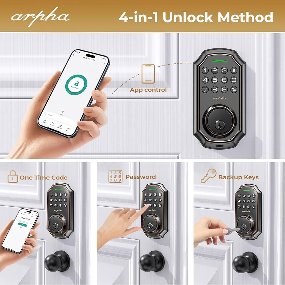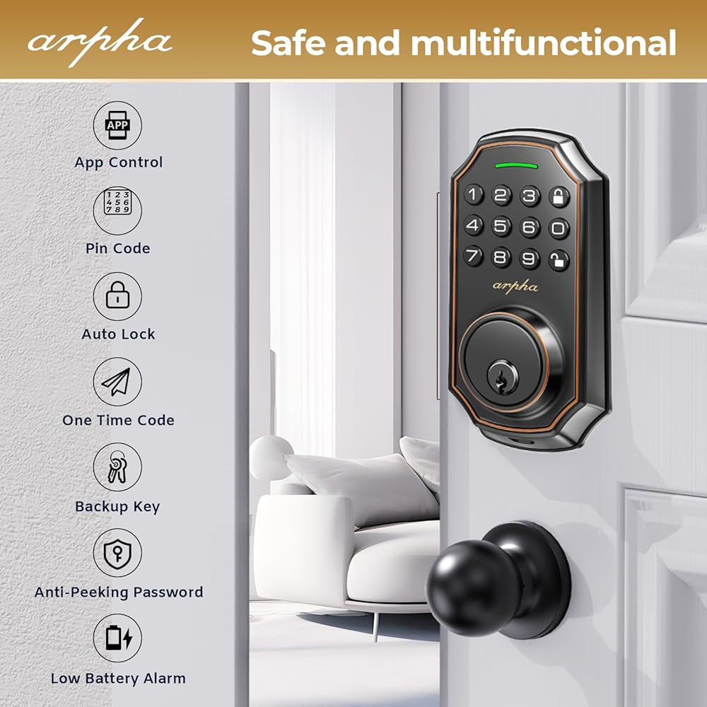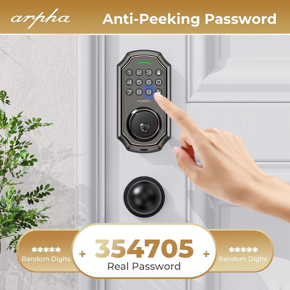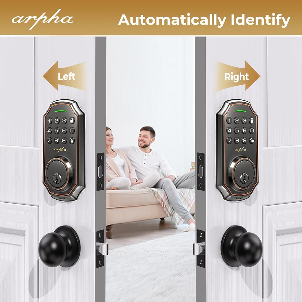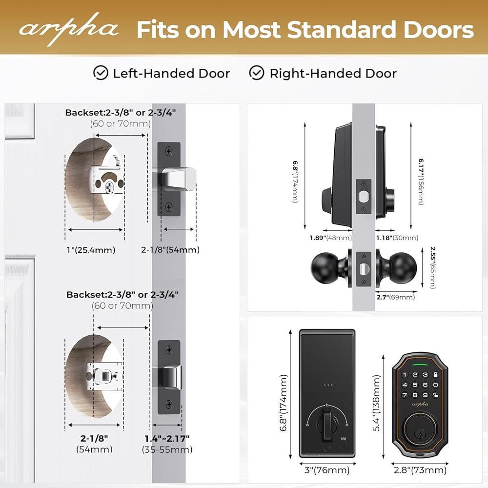 Easy to Install: Arpha keyless entry door lock with knob set fits on most US standard left-handed and right-handed doors. It is easy to install with just a screwdriver. Smart deadbolt lock fit door thicknesses from 1-3/8" to 2-1/8" (35mm - 55mm), backset 2-3/8" (60mm) and 2-1/8" (70mm).