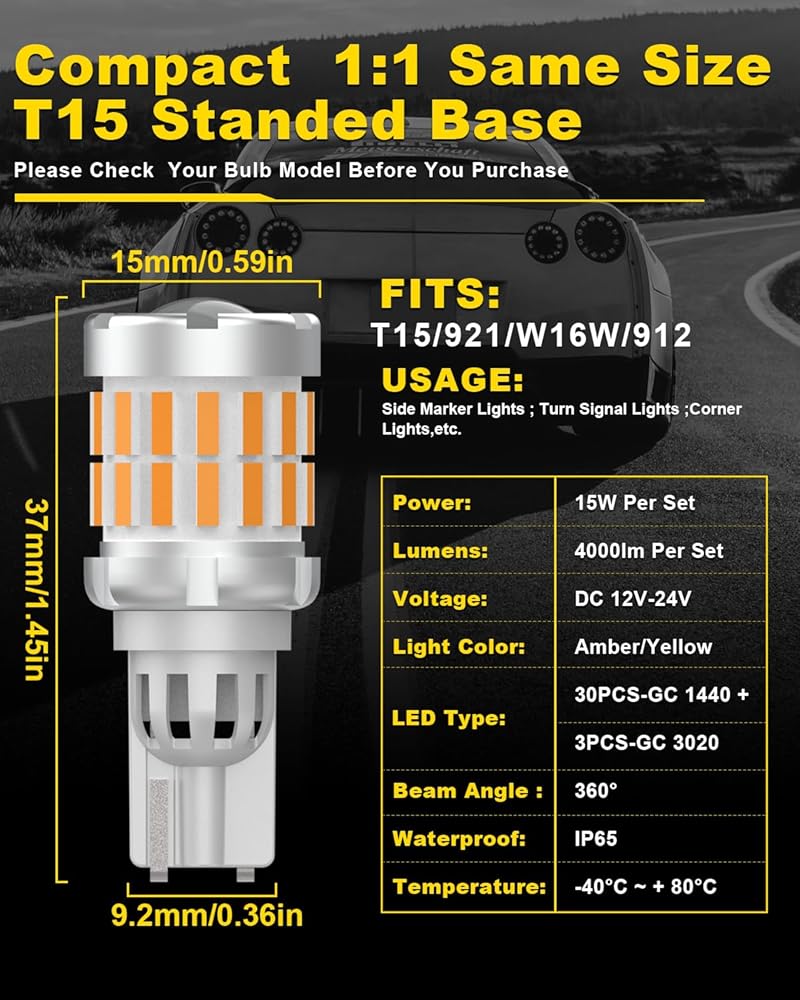 Amber 921 W16W Led Bulbs Canbus Error Free for Cargo Lights,912 T15 Turn Signal Blinker Side Marker Lights,Yellow 921 Led Bulbs Replacement for Corner Lights,Cab lights,4000Lm 3000K(2 PCS)