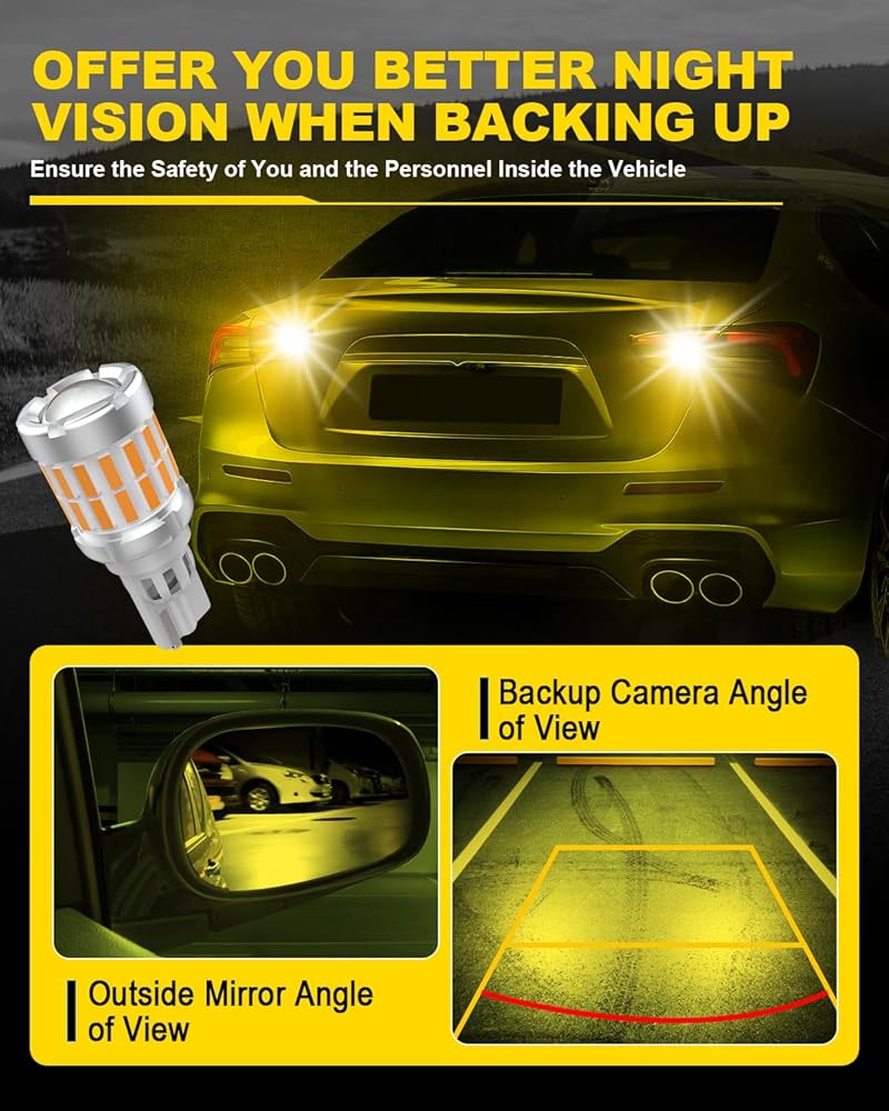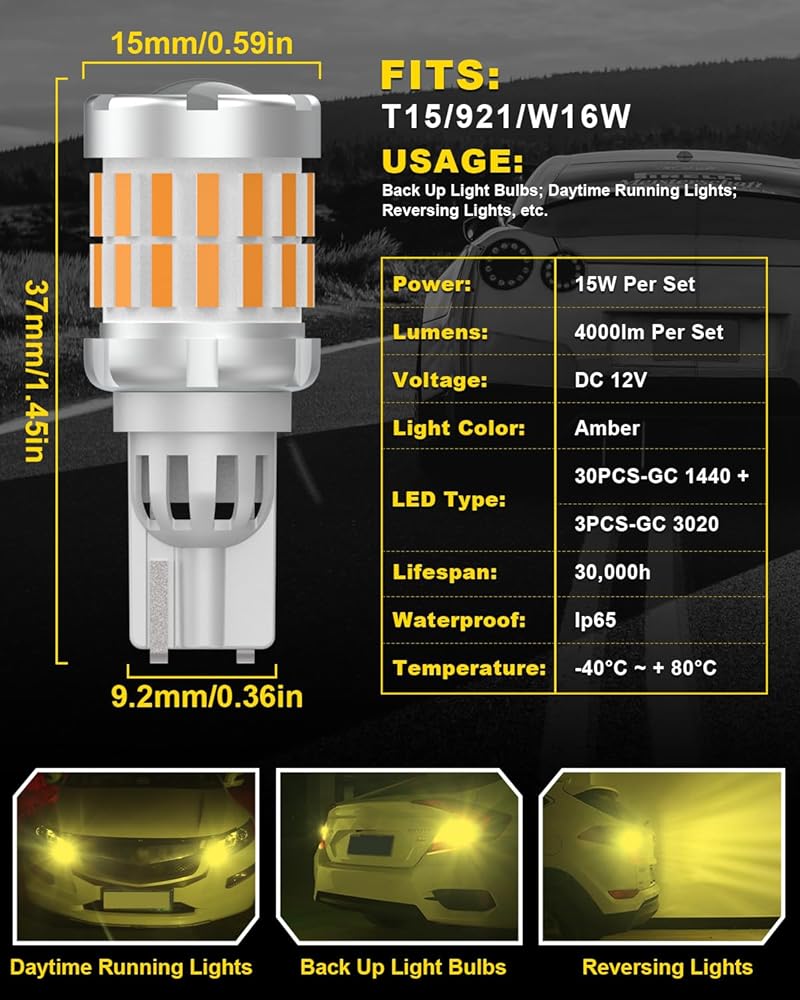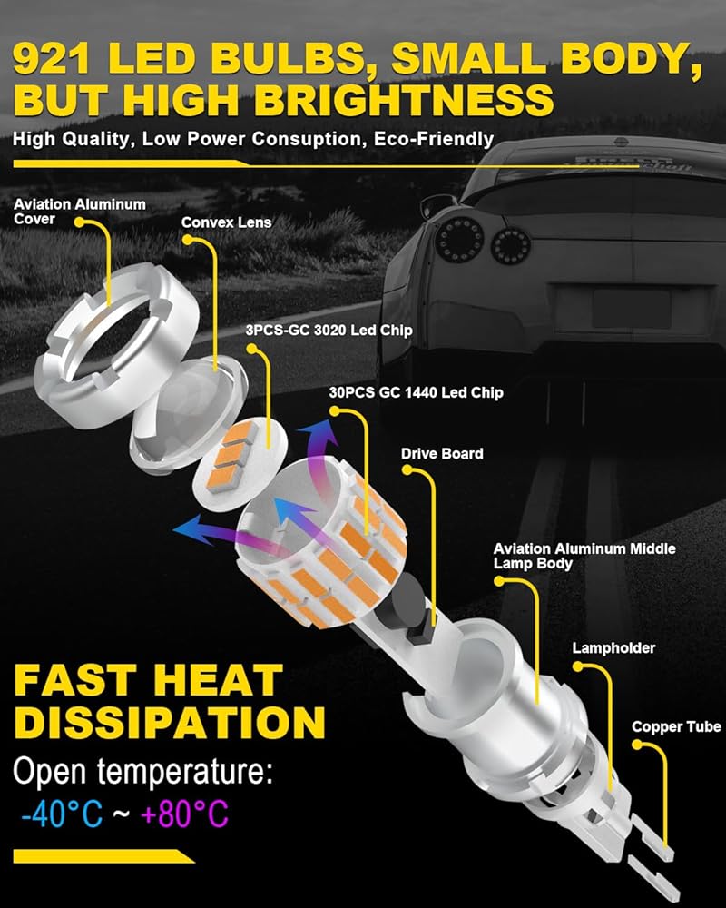 🌺【300% Brighter Than Halogen】Each 921 bulb with ultra bright 33 pcs high power chipsets leds , 30PCS-GC 1440 + 3PCS-GC 3020. Power: Per pair is 15w(per bulb is 7.5w); Lumens: 4000lm per pair(per bulb is 2000lm). Wide Voltage: 12V-36V & Low Power Consumption.; Beam Angle: 360 degrees. From the parameters, it can be seen that the 3 times brighter than original reverse light bulbs.