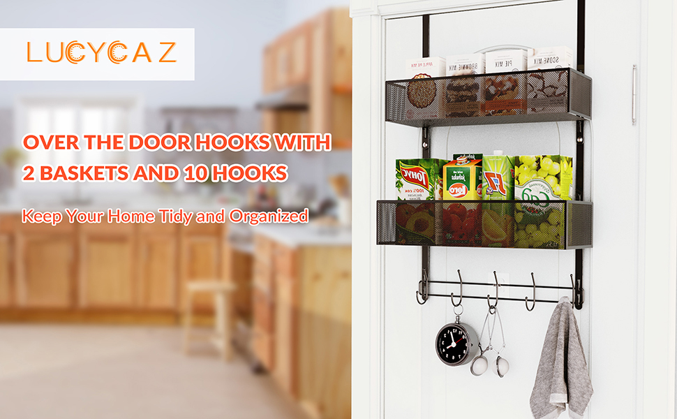 👍【User-friendly Design of Over Door Organizer】 LUCYCAZ over the door hooks can store easily, 2 wire-mesh baskets design, the mesh and grid is tight, so no need to worry about your things falling.not only for small items like cosmetics, necklaces, earrings, bracelets but also large bottles. The over the door hanger have 10 round-head hooks, prevent clothes from being scratched, perfect for hanging bath towels, pajamas, bath balls.
