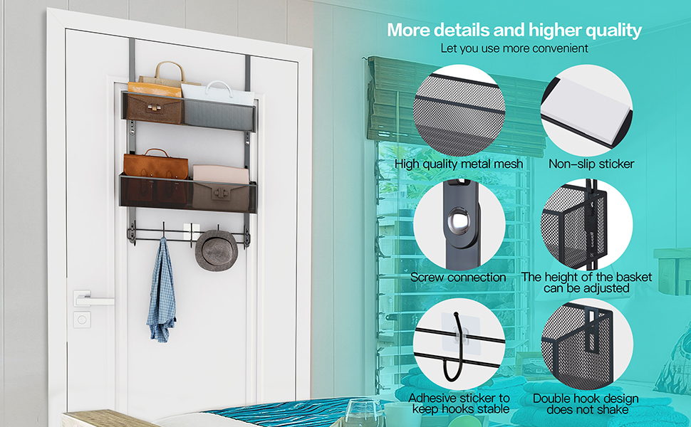 👍【Easy Installation】No screws, spanner or drilling required, over the door hanger can be easily assembled in a few seconds. We have snap design at the connection and you just need to buckle the basket and hook. Over the door storage are equipped with 2*PVC protective pads and 1* fixed sticker to keep coat hooks stable and avoid noise.