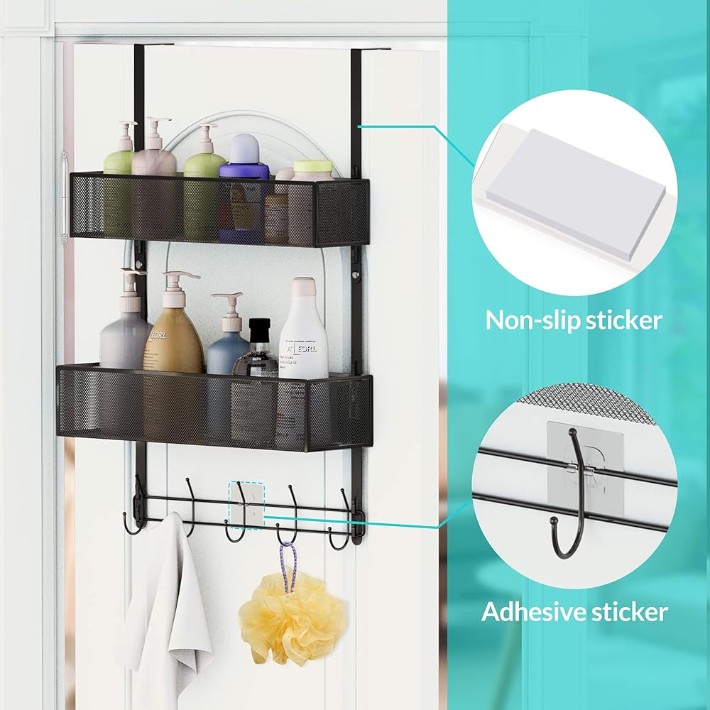 LUCYCAZ Adjustable Over The Door Hooks Organizer, Door Hanger Towel Rack with 10 Coat Hooks & 2 Mesh Basket, Over Door Storage Rack Back of Door Organizer for Barthroom Kitchen (Black)