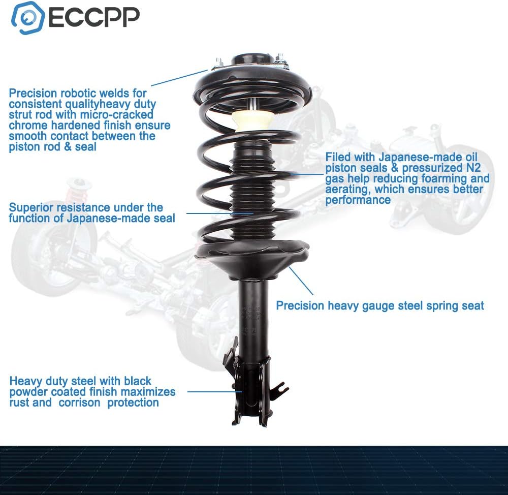 QUALITY - ISO / TS16949 premium quality strut plus SAE9254 spring steel competitive springs plus special surface treatment combined complete strut with the quality of STRENGTH, TOUGHNESS and ANTI-CORROSION more tolerant to vibration and extreme temperature