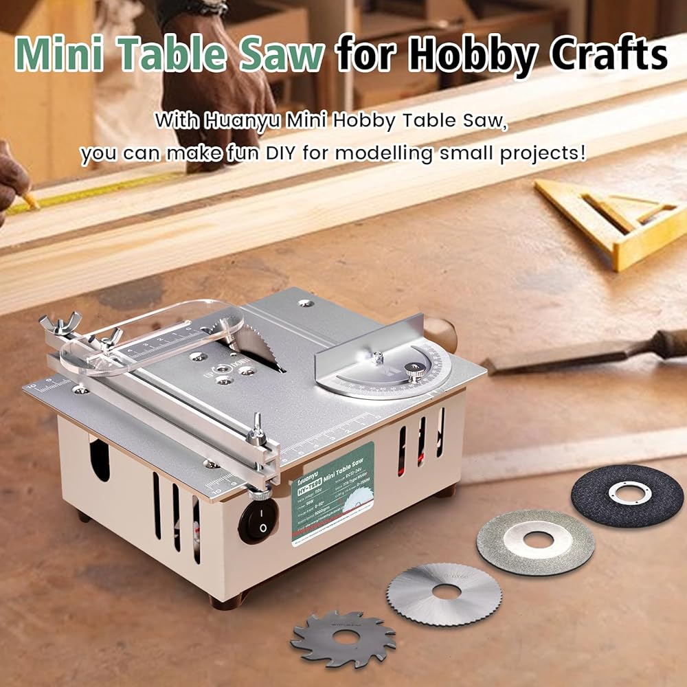 【Portable Mini Table Saw】Huanyu mini table saw with compact and portable design, easy to use. Machine Size: 190 * 145 * 80MM, the saw blade can be hidden and stored inside machine, take up less space, making it a compact table saw suitable for household use.
