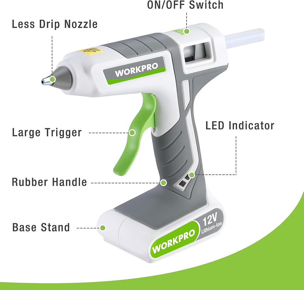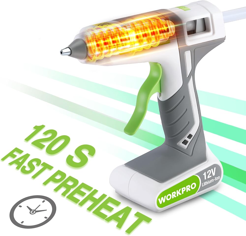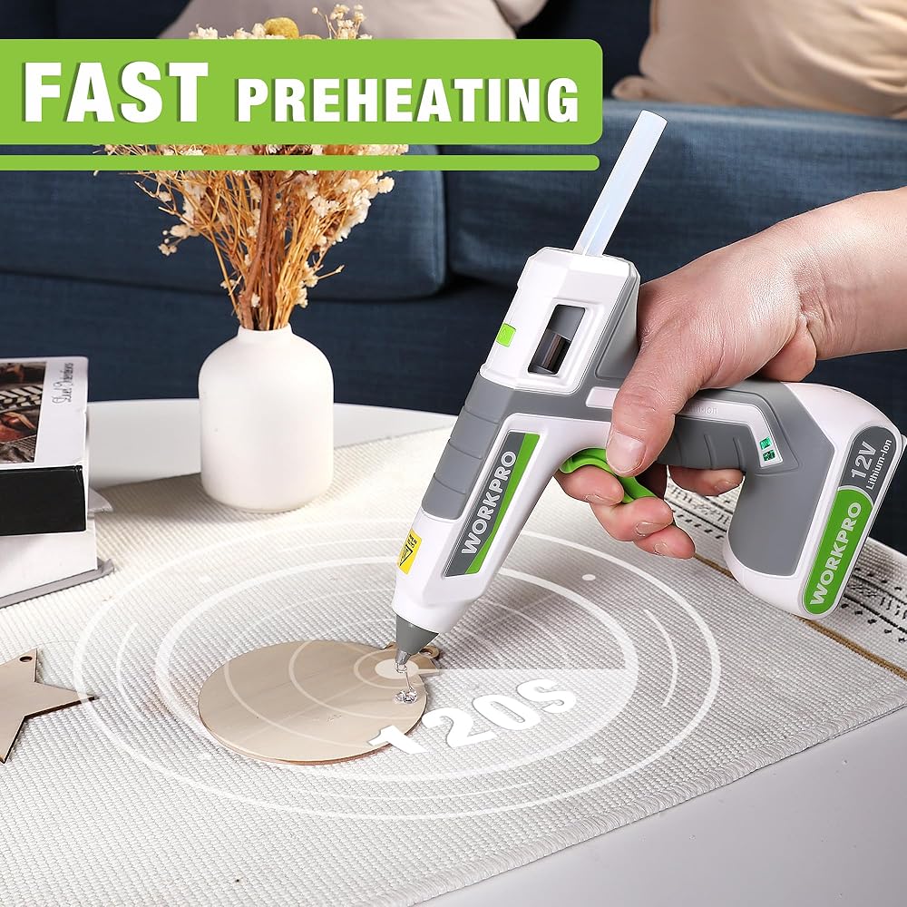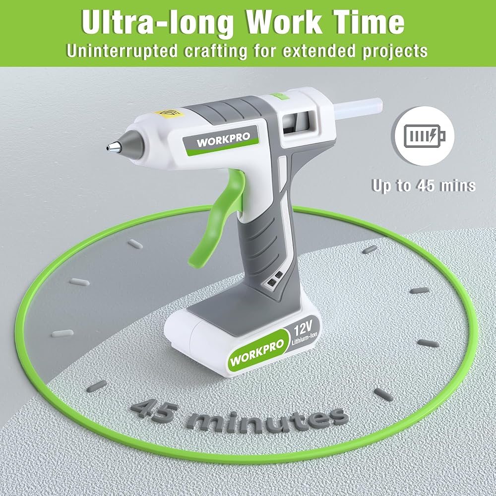 WORKPRO Full Size Cordless Hot Melt Glue Gun - 12V Rechargeable Fast Preheating Glue Gun Kit with 15pcs Full Size Glue Sticks, Auto Power-off Glue Gun for DIY Project, Art, Craft, Decoration - White