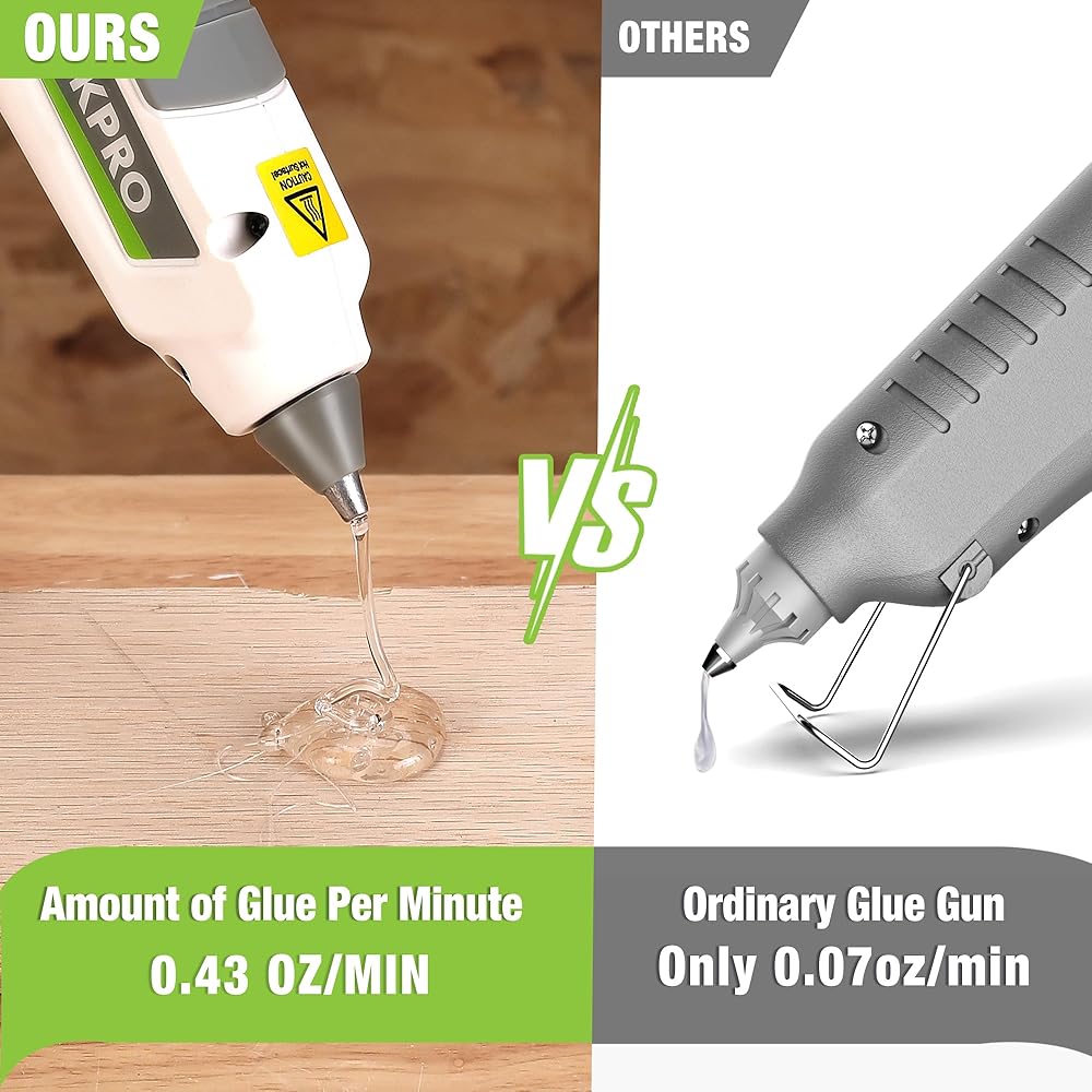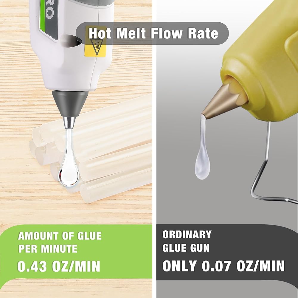 Fast Glue Output - This wireless hot glue gun boasts a very fast glue output speed, dispensing 0.43oz per minute, much faster than other full size hot glue guns that only dispense 0.07oz/2g per minute. Our low-leakage nozzle design effectively prevents glue spillage, saves more glue sticks, and keeps your work area clean. Also, the hot glue gun comes with a vertical stand that is convenient to use at any time.