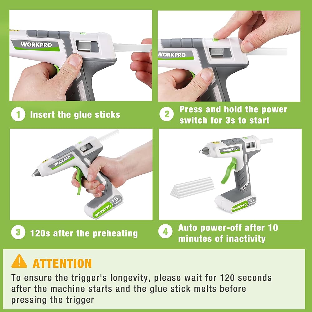 Long-lasting Battery - This battery glue gun is equipped with a high-capacity built-in battery, our full size hot glue gun can work for up to 45 minutes without the need for frequent recharging. Additionally, its intelligent linkage switch automatically shuts down after 10 minutes of idle use to protect user safety, save energy, and prolong battery life.
