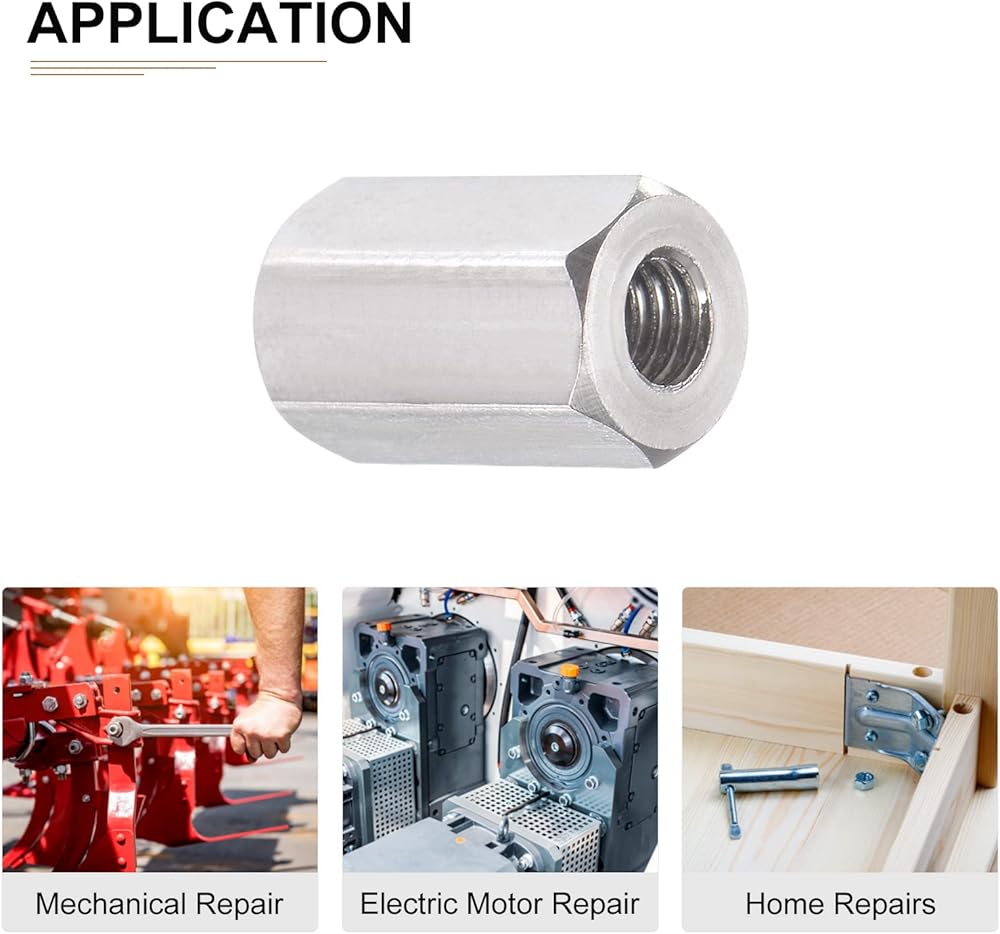 Application - The hexagon coupling nut is used for machinery industry, home furniture repair, equipment, garages, cars, metal shelves, art and craft work, etc.