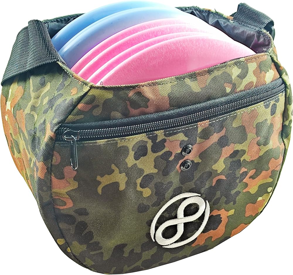 The Infinite Discs Easy Bag is design to be a very affordable, basic bag to carry your discs while you play disc golf. It can hold 8-10 discs and comes with a simple front pocket in which you can stow your small accessories, keys, or phone. It has two front snaps so you can close the top flap and keep the discs from falling out while you carry your discs to the course. The adjustable shoulder strap makes it very easy to carry.