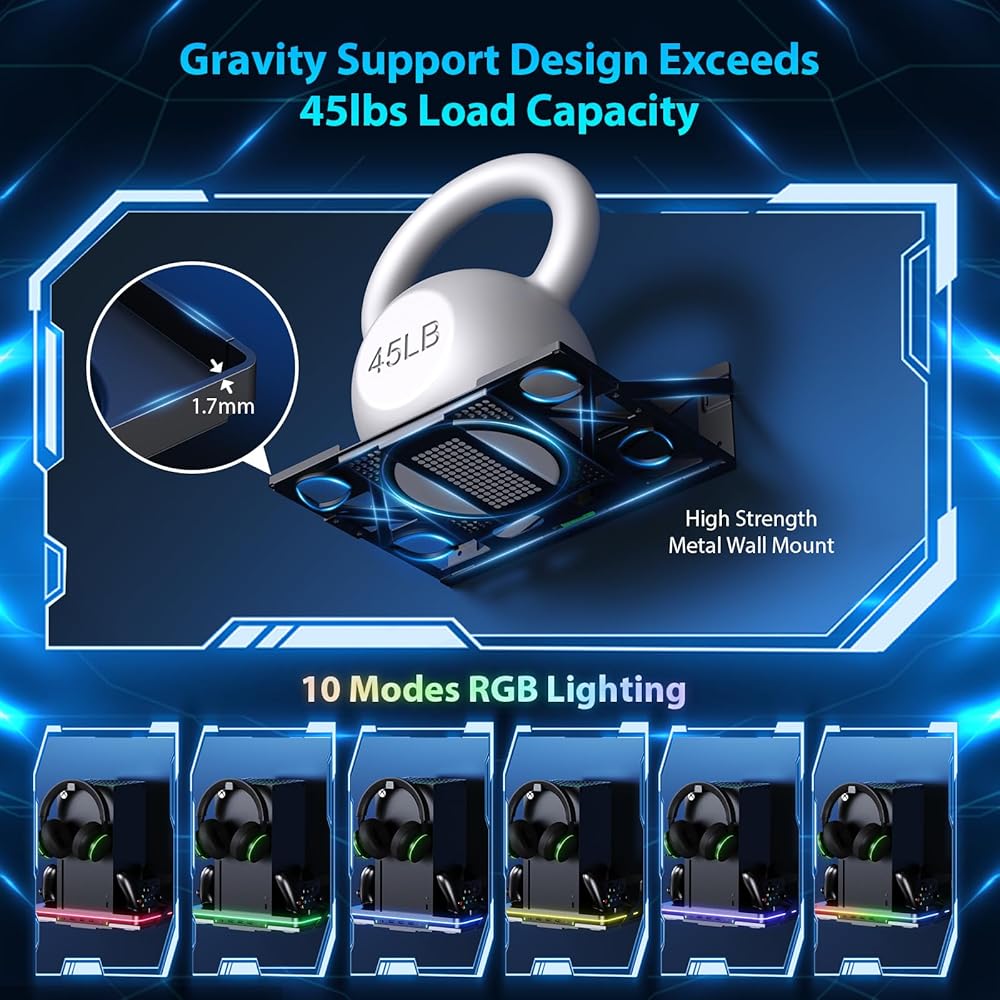 【Designed for Xbox Series X/S Wall Mount】This wall mount for Xbox series X/S is made of High-quality metals for reliable strength and durability, which allows it to bear up to 45 lbs. This wall mount can place your console to be front facing, and it won't block all ports and disk drive on the console. It can safely store your console, headset, controllers. you can install this wall mount on the left or right side of the TV to give you the best gaming experience on the big screen.