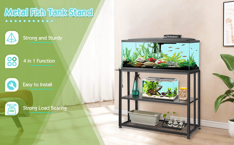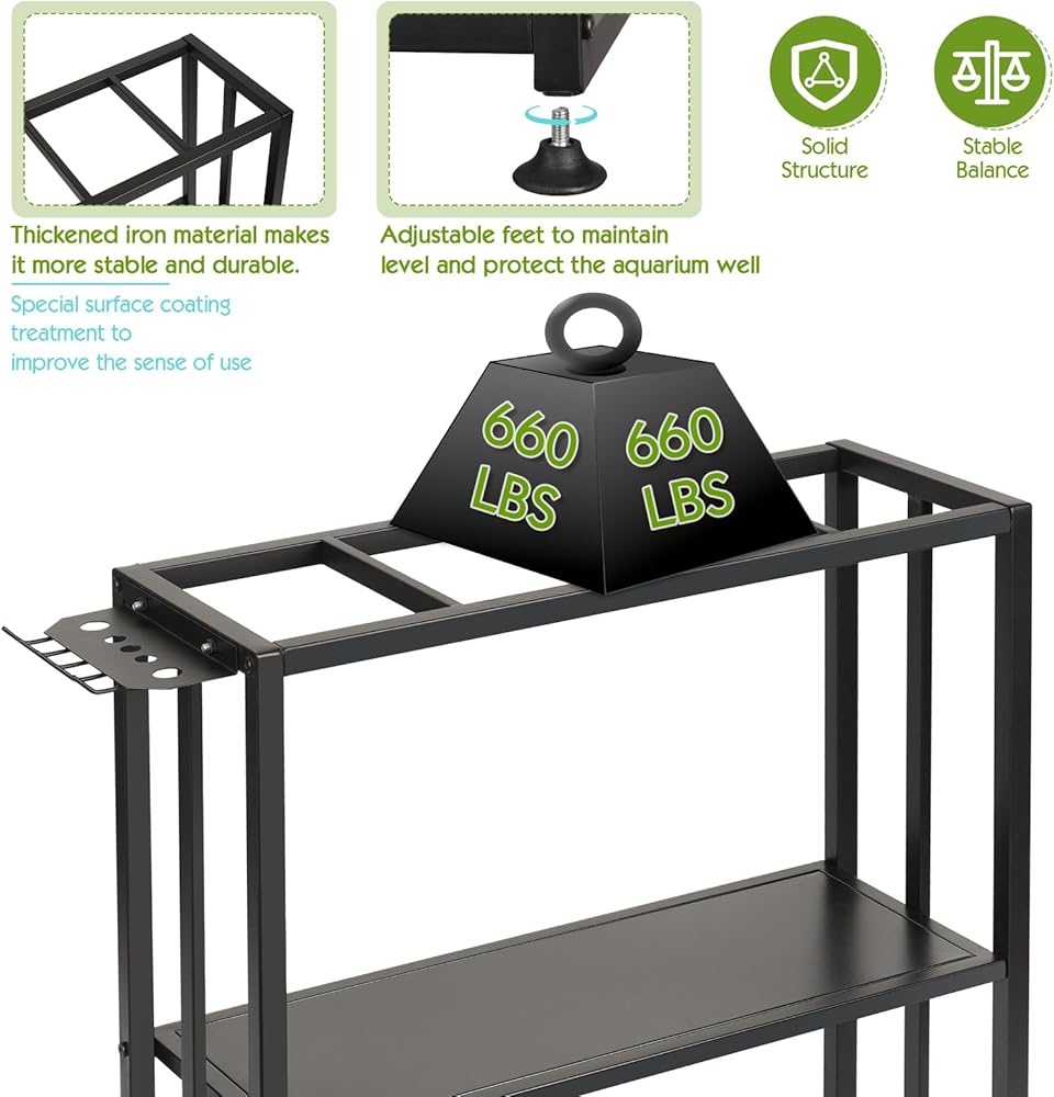 Sturdy and Enduring: The fish tank stand is made of thickened metal material, with a stable structure and strong load-bearing capacity, which can provide maximum stability to ensure that it can bear the weight of the aquarium without shaking. And the surface is treated with special coating to improve the sense of use.
