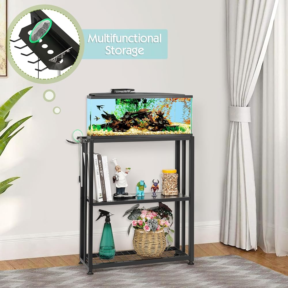 Multifunctional Design: Unlike other traditional fish tank stand, this aquarium stand adopts a three-layer design. The top layer can be used to place an aquarium, and the middle can also be used to place other capacity aquariums, aquatic plants and potted plants. The bottom is convenient for you to store fish feed, Items such as fishing nets. And the side shelf can store aquarium tools and keep it tidy.