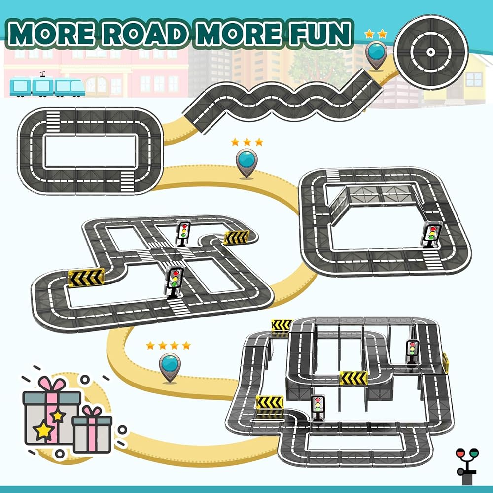 【Educational & Funny】The magnetic tile roads provide kids with a limitless creative play space where they can create tracks, elevated bridges, tunnels, ramps, and more for toy cars, race cars, buses, and other car games. By simulating real traffic scenarios, kids can learn about traffic rules and safety awareness. This hands-on learning approach helps them better understand and apply the knowledge they acquire, making magnetic tile roads a valuable educational tool that in classroom must haves.