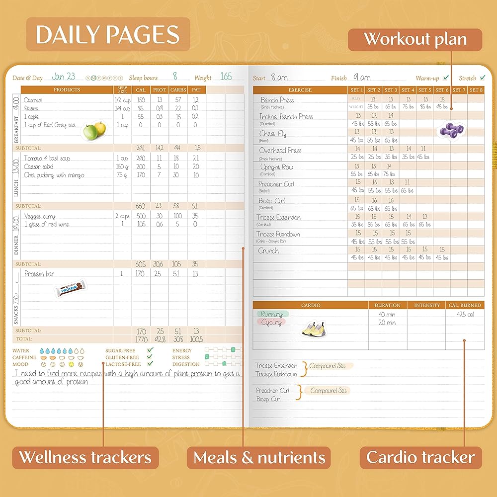 PLAN EACH DETAIL OF YOUR DAILY MEALS & WORKOUTS: This Food and Fitness Journal features detailed daily pages to plan meals and workouts and track daily nutrients, water intake, energy level, and other health data.