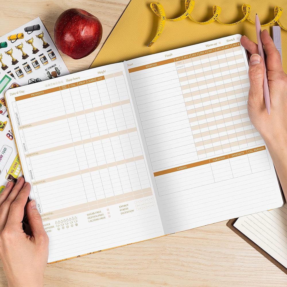 STICKERS, USER GUIDE & LARGE FORMAT: This fitness journal for women comes in large format (7.5x10 inches). The exercise journal has an eco-leather hardcover, thick 120gsm paper, 3 bookmarks, pen loop, elastic, pocket for notes, stickers, and user guide.
