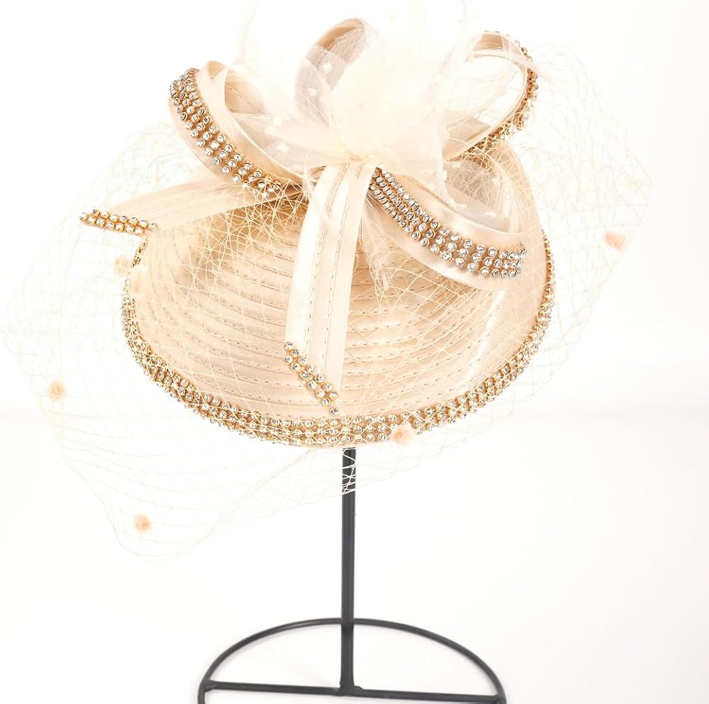 Composed of a Pillbox Hat. Decorative Veil ,Feather, Bow knot Attached to the Hat, And a Crystal Band is Accented Around the Crown.