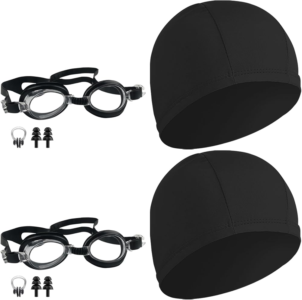 2 Pack Black Swimming Cap Swimming Goggles for Both Adults & Kids Fabric Durable Non-Waterproof Cloth Swimming Pool Cap No Leaking Anti Fog UV Protection Goggles, with Nose Clip, Ear Plugs