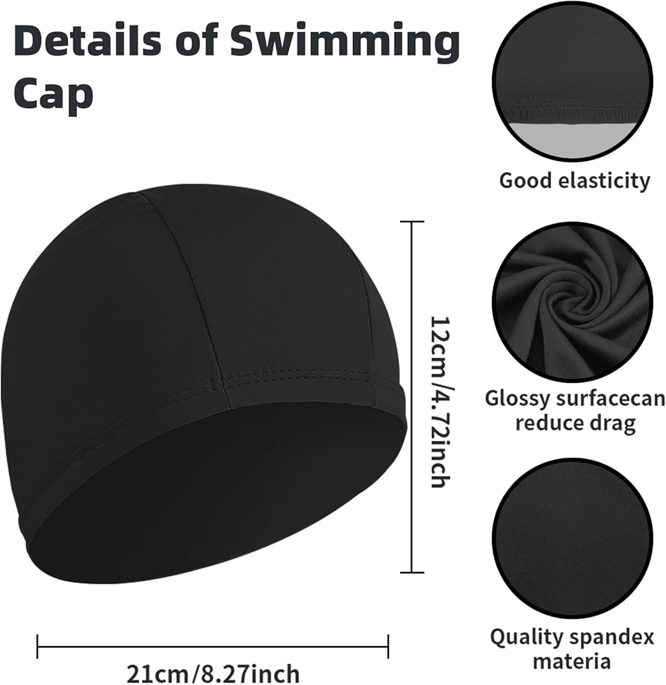 Swimming cap: the swimming cap is made of quality spandex materia, which has strong durability and elasticity, which is not only soft and comfortable to wear, not easy to fade and tear, durable and practical, but also can be applied for a long time