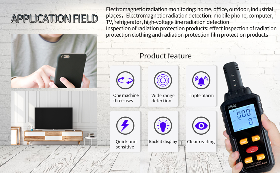 Scope of application:Electromagnetic radiation monitoring:Home,office,outdoor,industrial,Mobile phone,computer,Tv,refrigeratorhigh voltage line radiation detection;Test the effect of protective equipmentsuch as radiation protective clothingand radiation protective film.
