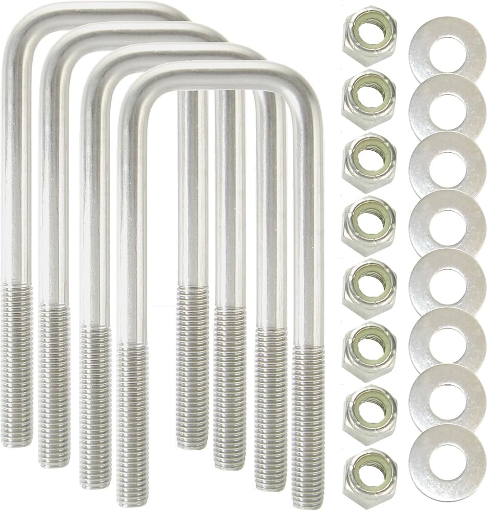 In this package are (4) SS U-Bolts, (8) SS Washers, (8) SS Locknuts made out of 304 Stainless Steel.