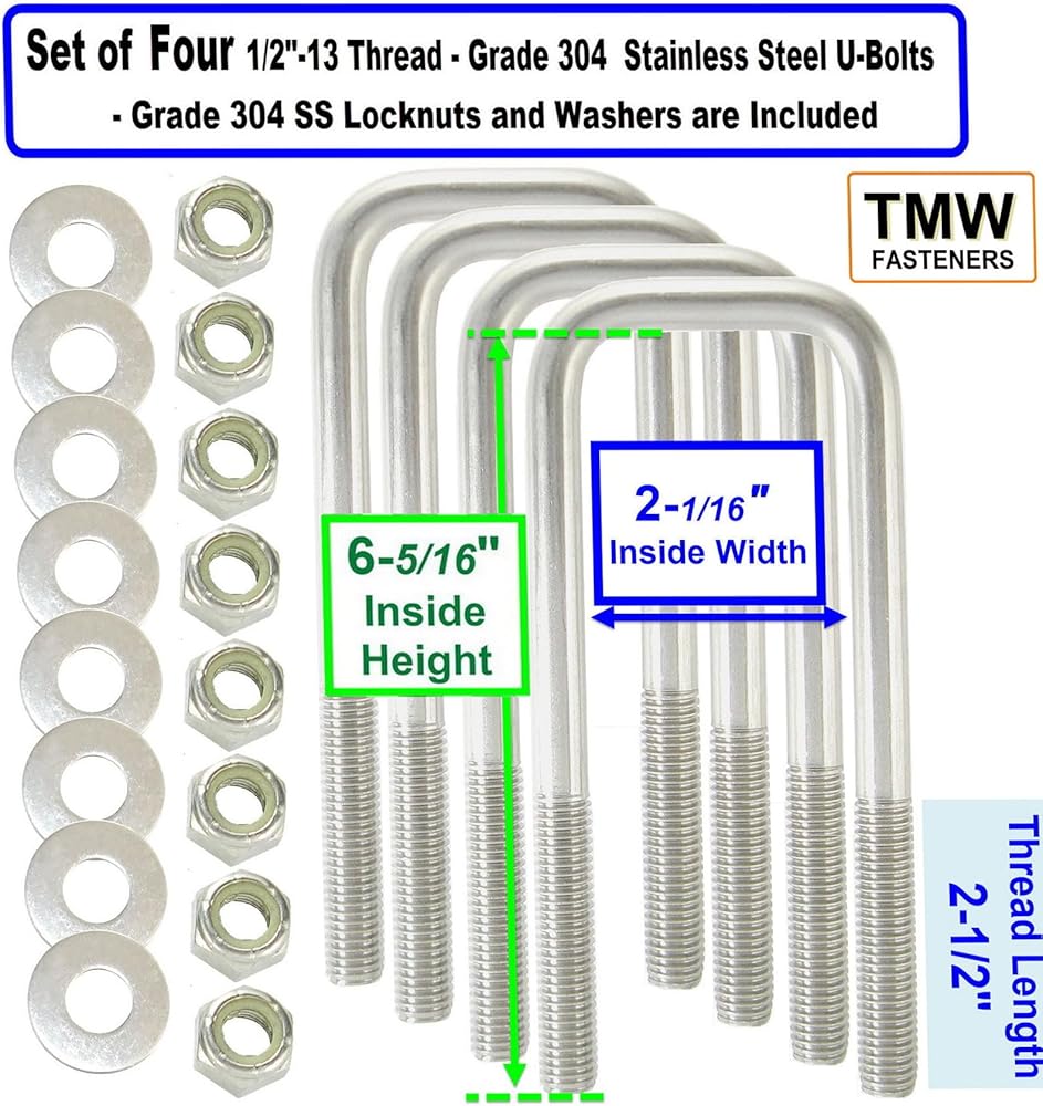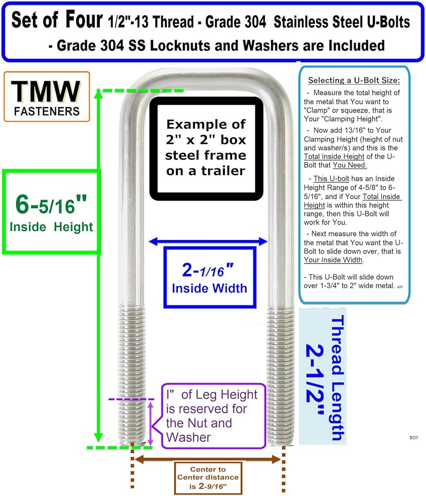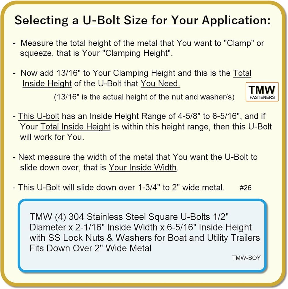 TMW (4) 304 Stainless Steel Square U-Bolts 1/2" Diameter x 2-1/16" Inside Width x 6-5/16" Inside Height with SS Lock Nuts & Washers for Boat and Utility Trailers Fits Down Over 2" Wide Metal