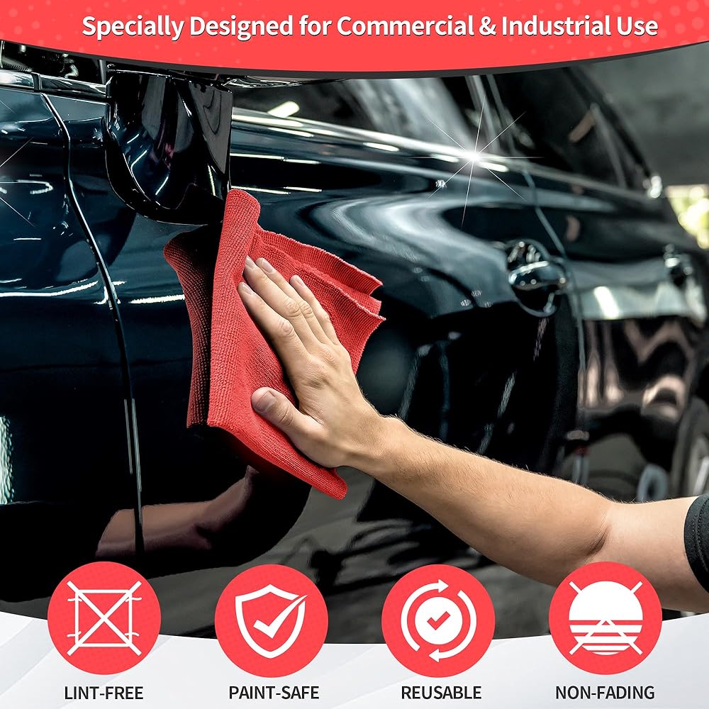 【NON-ABRASIVE & PAINT-SAFE】 Size 11.5" x 11.5", high capacity, economical 100 Pack. Featuring a sonic cut edge, our microfiber shop towels prevent scratching any surfaces including paints, stainless steel, glass, or ceramics in dry or wet conditions. Ultra-soft without tags and seams, these cleaning rags can block scratching issues even on paints, or coats. They accommodate all surfaces, great for wiping household surfaces or polished furniture.