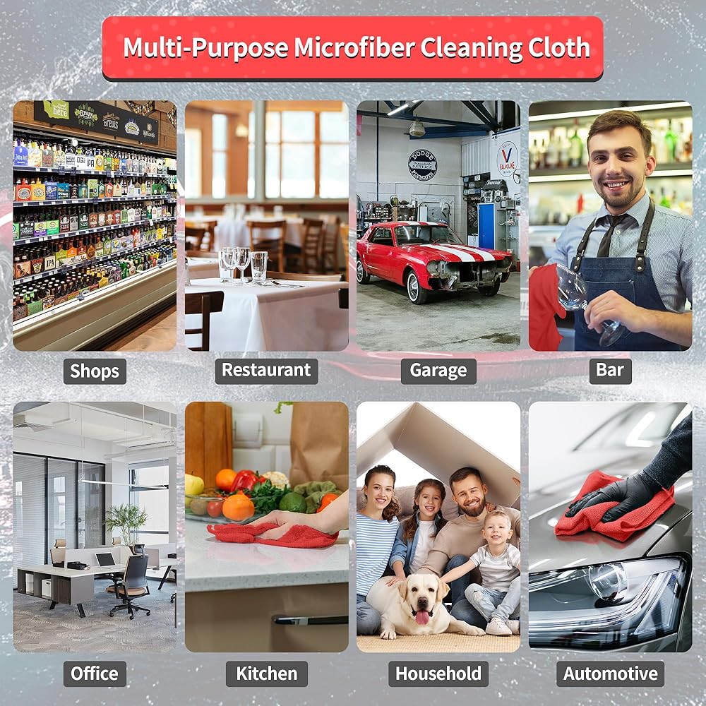 【ALL PURPOSE & EFFECTIVE CLEANING CLOTH】Popular and economical options for shops, garages, restaurants, warehouses, offices, works, labs, bars, and housekeeping Use. Suitable for polishing, washing, wiping, detailing, drying, or dusting the exterior and interior of any appliance. Multipack can be designated for multi-purpose use like dusting, mopping, and wiping for office and household cleaning from shops, kitchens, dinnerware, baths, garages, and windows to glass and mirrors.